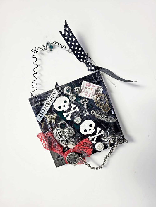 Black Wall Plaque with Skull & Bones Ribbon, Honesty Sign, Recycle Jewelry, Keys & Gears, Punk Goth Sign