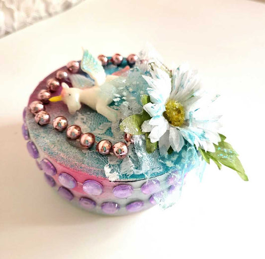 Recycled Round Jewelry Box with a Flying Pink Unicorn and a Daisy