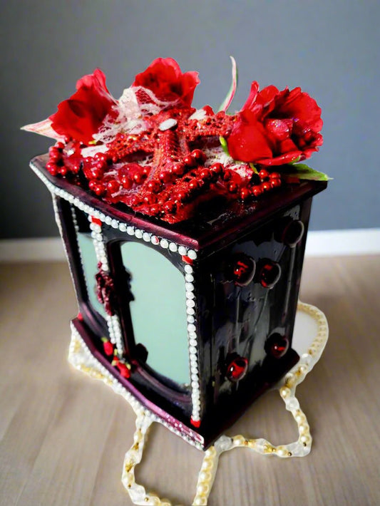 Black and Red Ladies Jewelry Box with 3 Red Roses, White Shimmering Lace and a Red Cross
