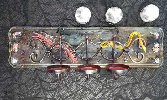 Black Metal Candle Holder, Holds 3 Battery Candles, with a Couple of Skulls, a Creepy Centipede and a Snake