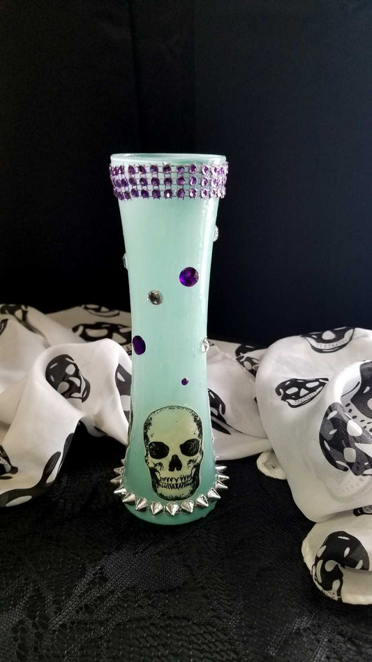 19 cm Tall Teal Colored Glass Vase with Skulls, Spikes and Resin