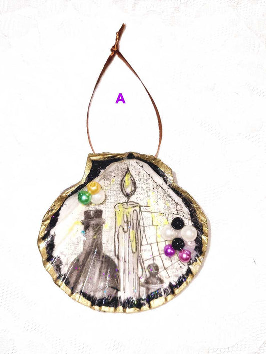 Decoupage Napkins on Sea Shells with Crows, Cobwebs, Potion Bottles & Candles, Hanging Ornament, Clam Shells Decorated