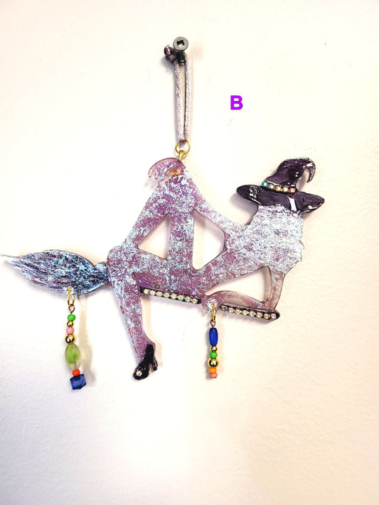 Resin WITCH Ornament striking a Sexy Pose on her Broom, complete with her Black Hat & Black High Heels