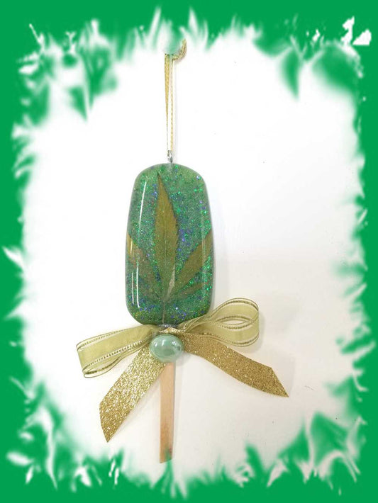 Window Hanger, Wall Hanger or Christmas Tree Ornament, Bright Vibrant Green Resin Popsicles with Glitter and Nature's Leavess