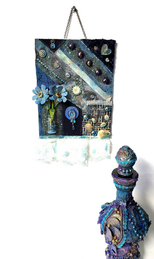 Multi Media Fabric Art Wall Piece in Shades of Blue, Collage, Decorative Wall Art