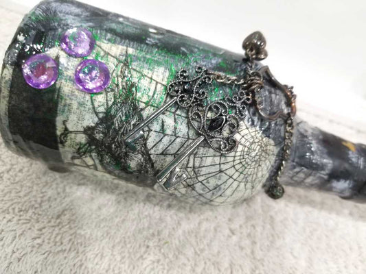 Altered Glass Bottle, Decanter, with a Crow, Chain with Keys, Purple Gems, Re-Usable
