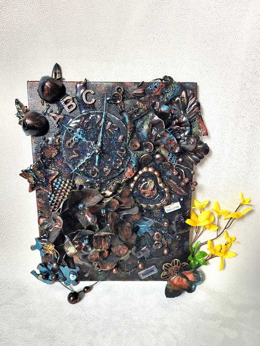 Black, Teal & Copper Faux Clock on Canvas Board with Apples & A, B, C's, Wall Hanger, Home Decor