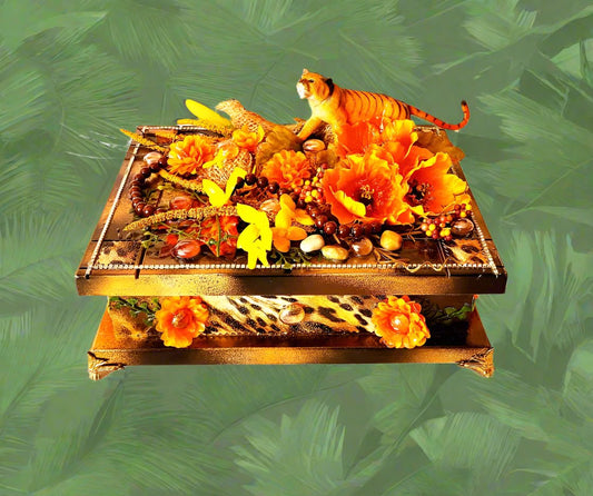 Jewelry Box with Orange & Yellow Flowers and a Tiger, Safari Themed