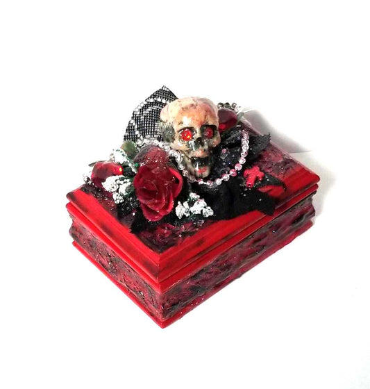 Small Red and Black Jewelry Box with a Skull and a Red Rose