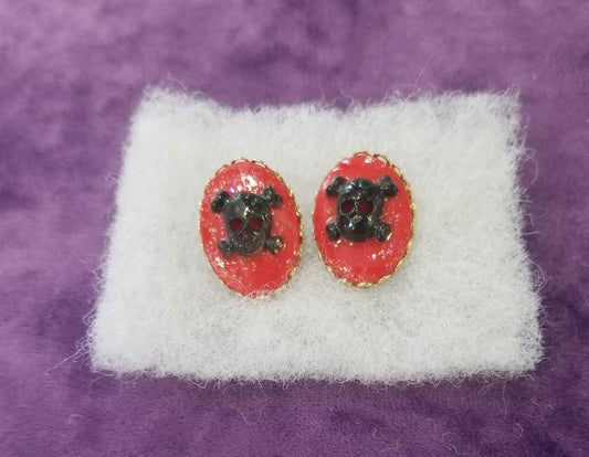 Red Porcelain Pierced Earrings with Black Skull & Bones