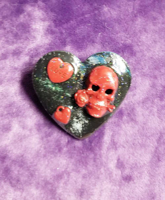 Black Porcelain Heart Shaped Brooch with Red Skull and Heart Charms