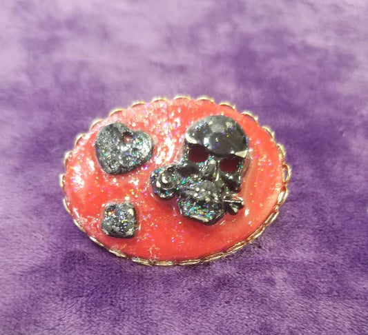 Stunning Red Porcelain Oval Brooch with Hand Painted Black Skull and Hearts