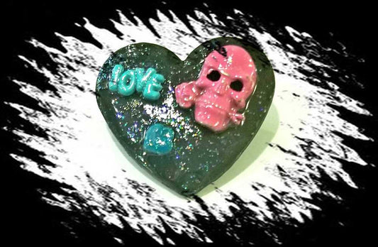 Black Porcelain Heart Shaped Brooch with a Pink Skull and a Teal Heart & Love Charm