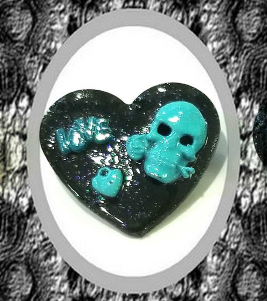 Black Porcelain Heart Shaped Brooch with a Teal Skull, Love and a Heart Charm
