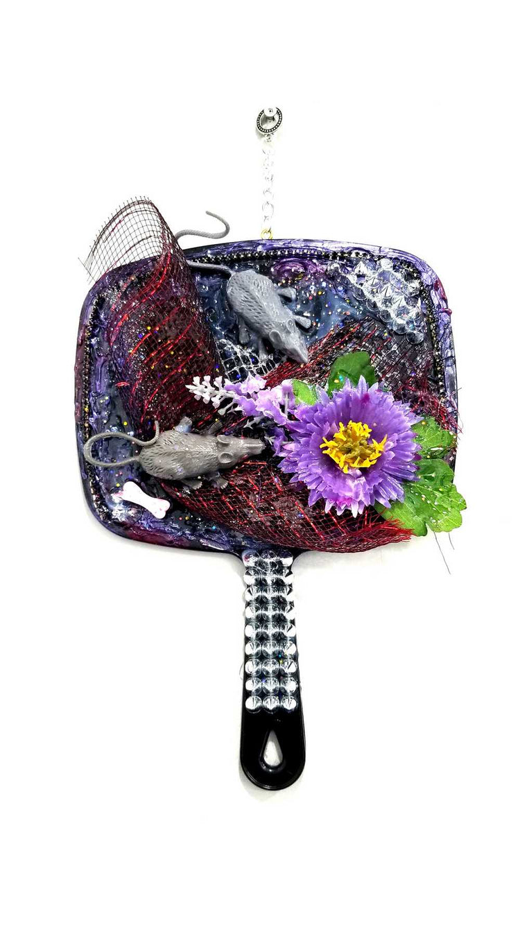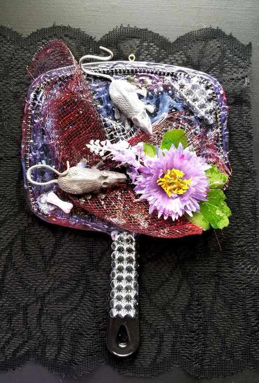 Black Studded Hand Held Mirror with Rats and Purple Flowers. Punk Art