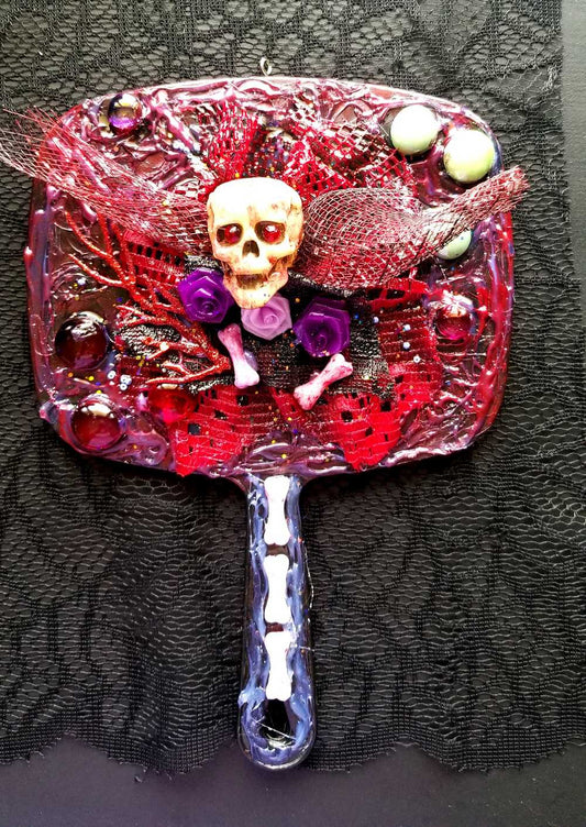 Black Hand Mirror, with Skull, Bones, Black & Red Lace, Goth Art