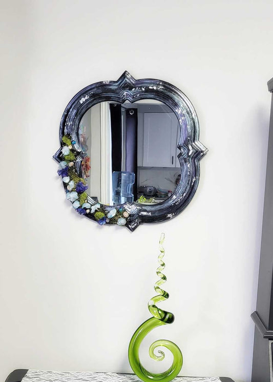 Black Hand Held Mirror with a Heart, Natures Leaves and Gemstones
