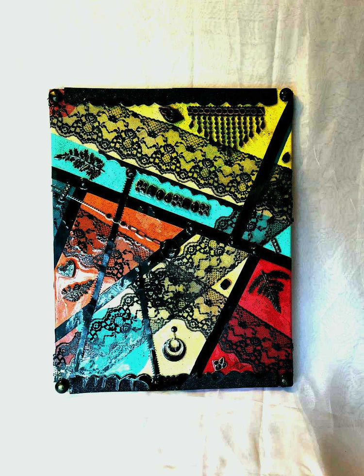Multi Media Mixed Art on 16x20 inch Canvas in Bright Colors w/Black Lace & Recycled Jewelry