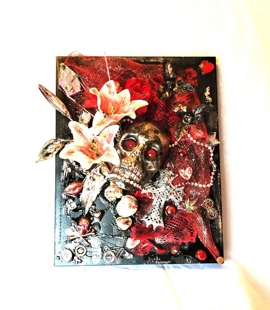 3D Skull and White Lilies, 45 x 36 x 18 cm on Black and Red Canvas