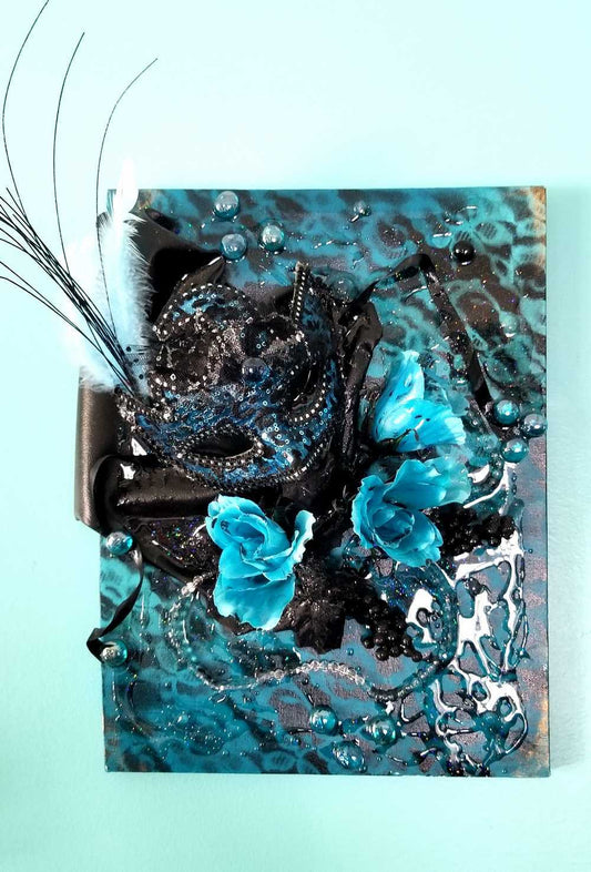 3D Canvas Art with Sexy Teal Blue Mask and Teal Blue Roses, 30 x 40 x 15 cm