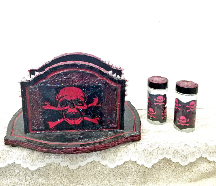 Black & Red Napkin Holder with Salt & Pepper Shakers Decorated with Red Cross & Bones Skull