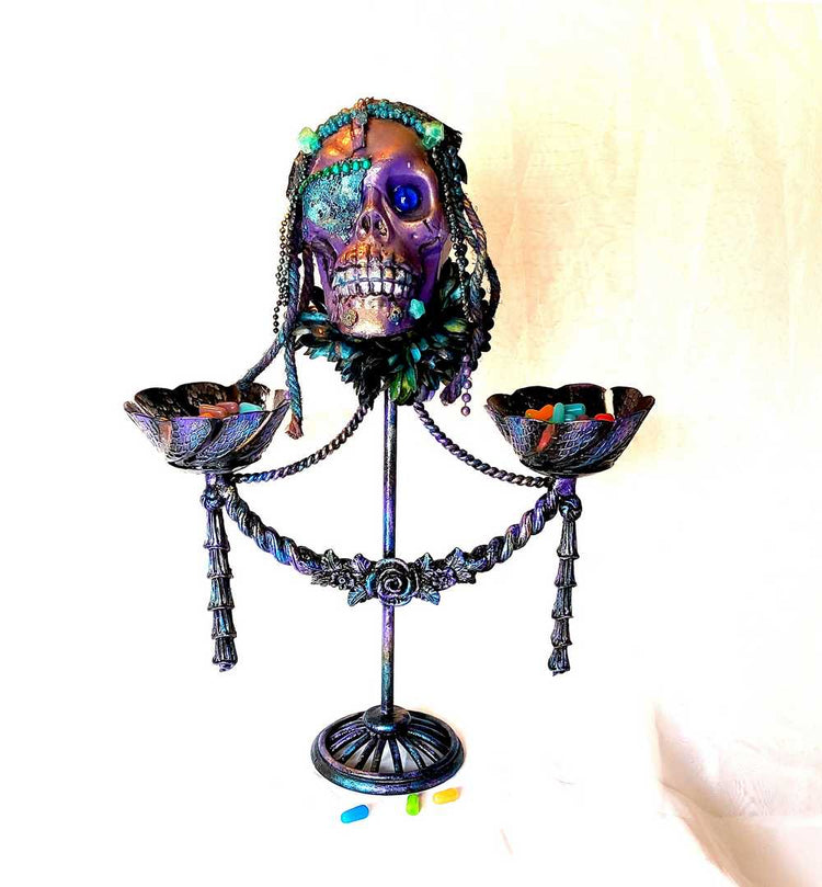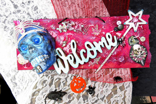 Welcome Sign With a Silver Colored Skull With Piercings Wearing a Crown And Her Scepter