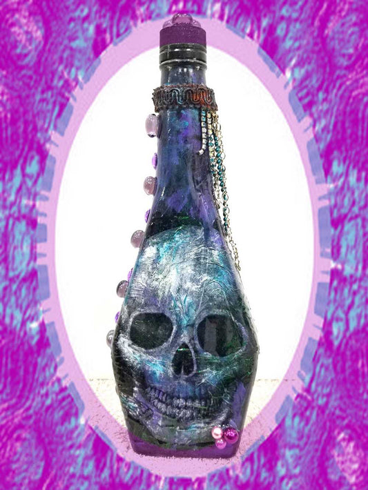 Altered Glass Bottle, Decoupage Skull Art Bottle for Re-Use