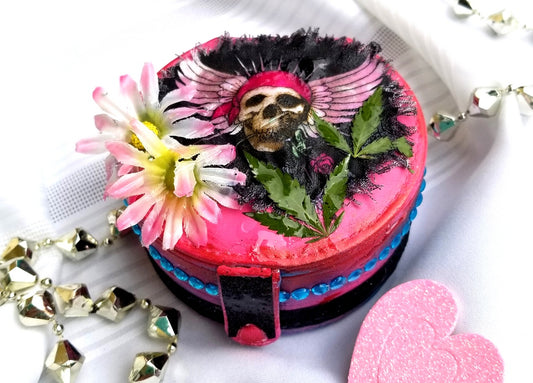 Travel Pink Skull Jewelry Box with a Daisy and Pot Leaves