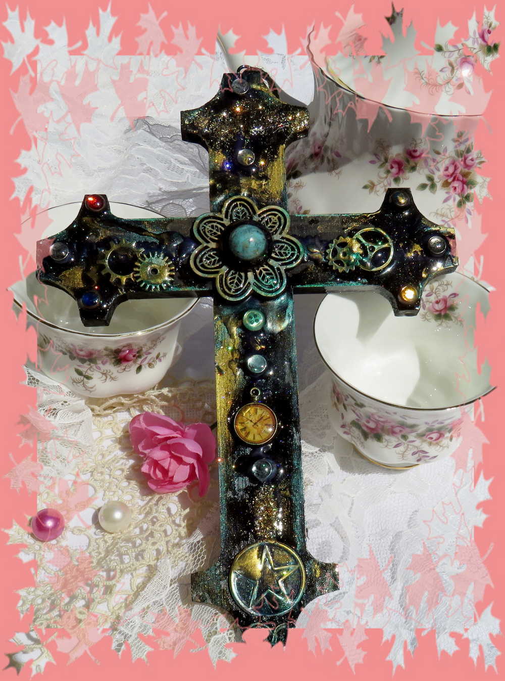 Elevate your alternative style with our Altered Wood Goth Cross. Handmade with care, this black wooden cross is adorned with intricate gears and colorful beads, making it the perfect addition to your punk or witch-inspired decor. The unique combination of materials and design adds a touch of individuality to any space.