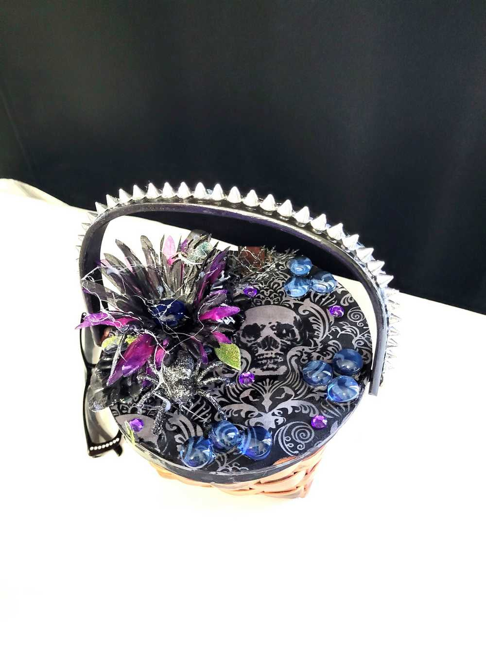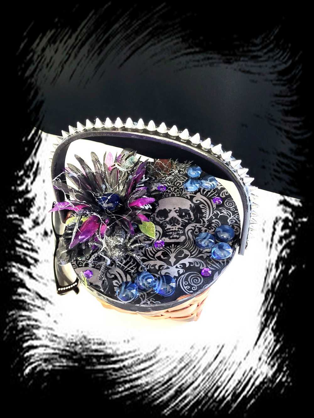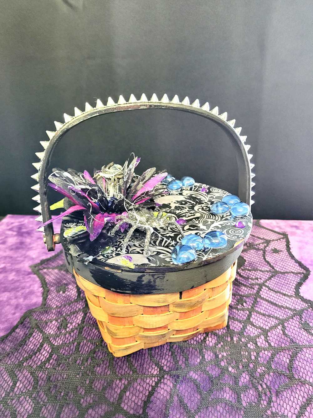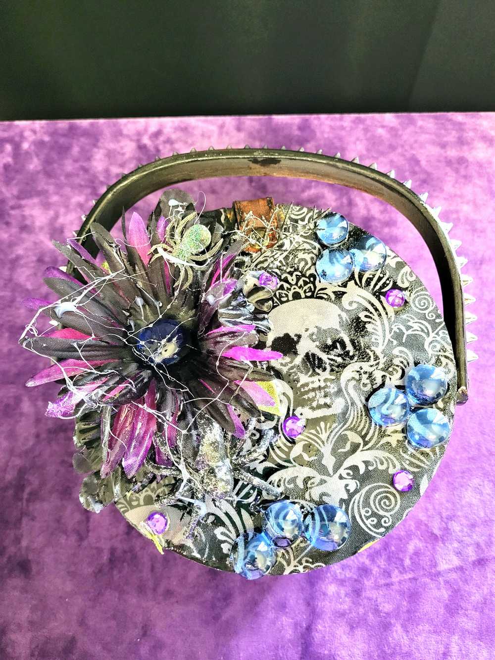 Wood Basket Covered with Black Skull Fabric, with a Purple & Black Flower, Blue Glass Cabochons & a Large Sparkley Spider