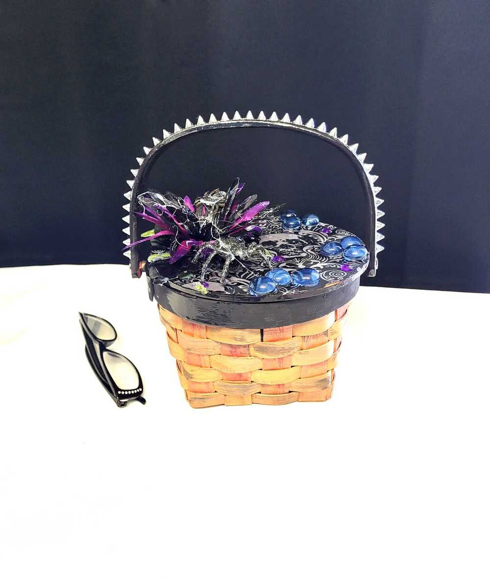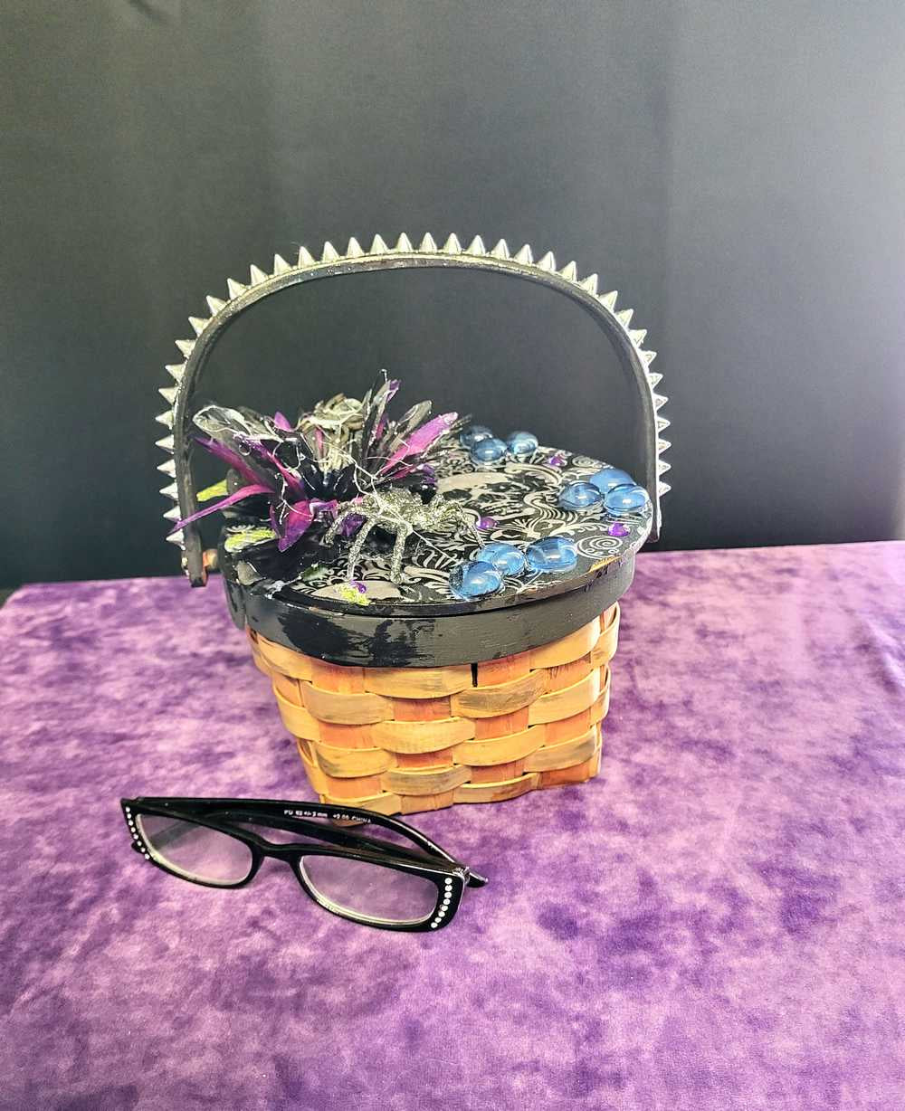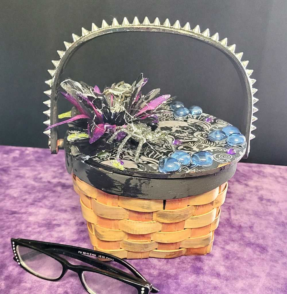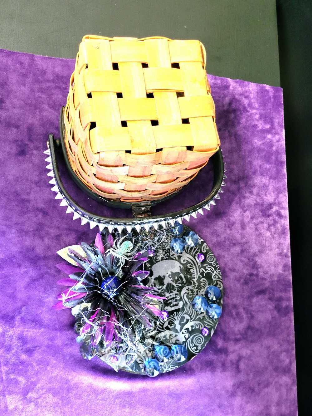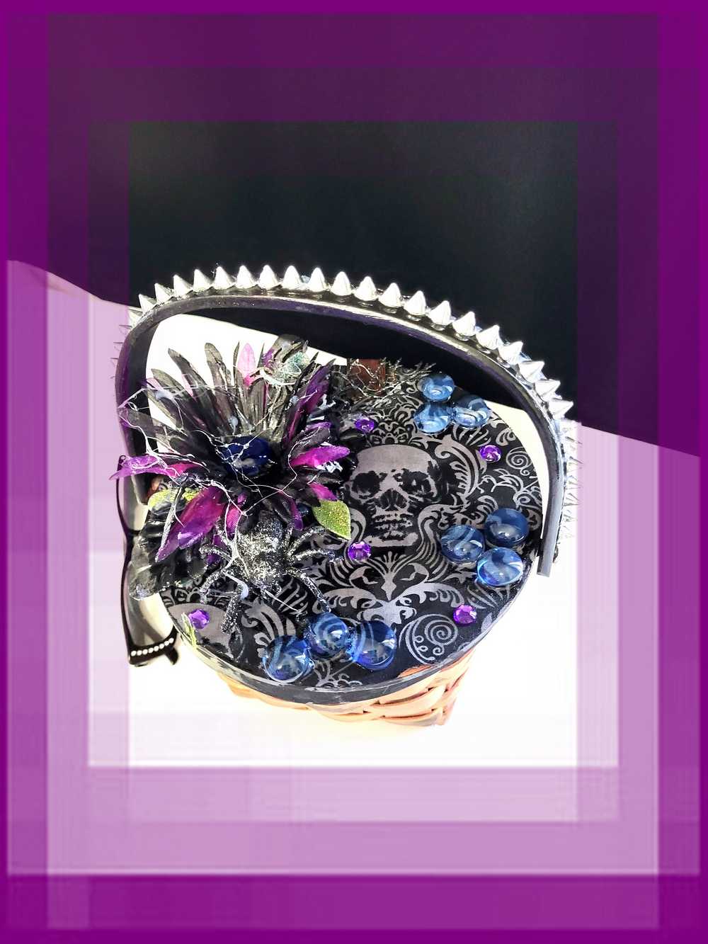 Wood Basket Covered with Black Skull Fabric, with a Purple & Black Flower, Blue Glass Cabochons & a Large Sparkley Spider