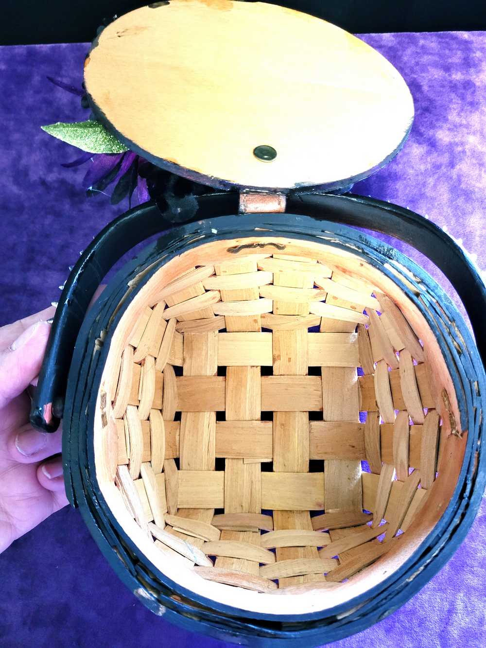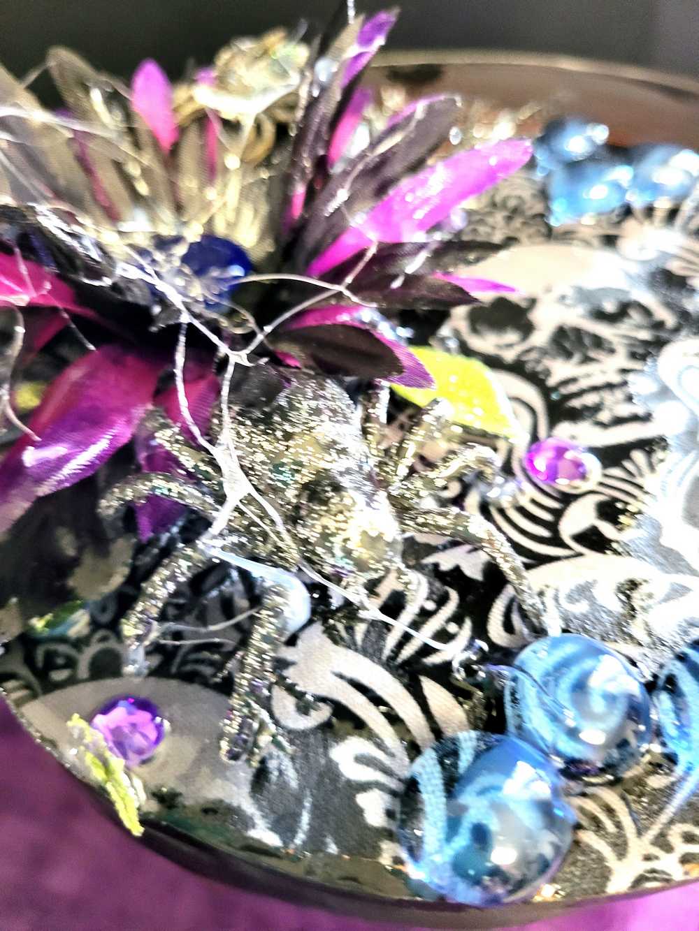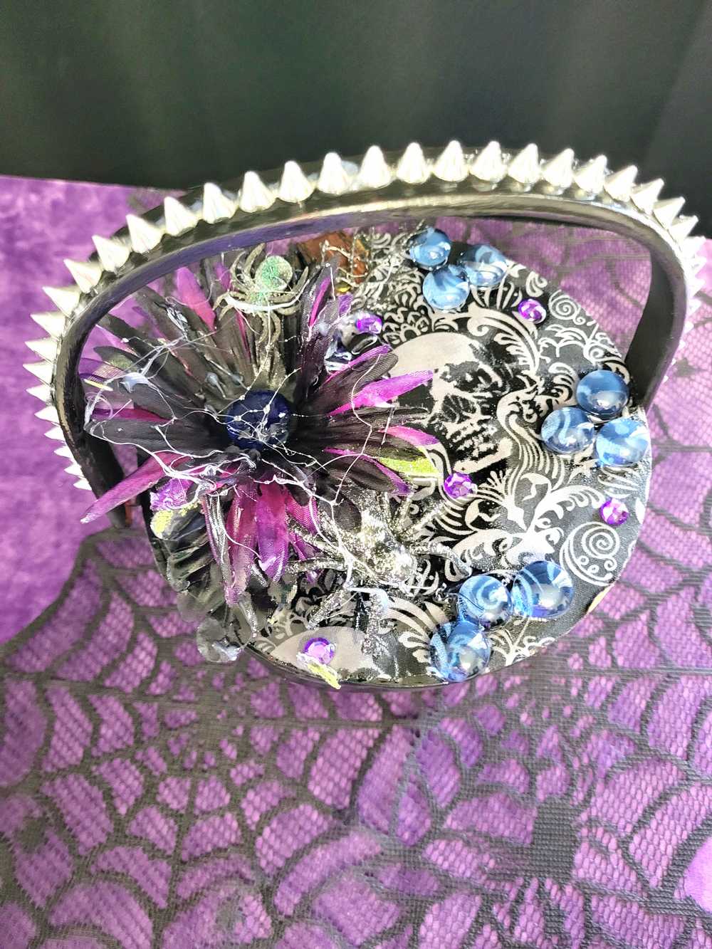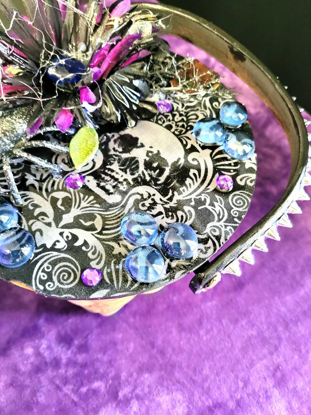 Wood Basket Covered with Black Skull Fabric, with a Purple & Black Flower, Blue Glass Cabochons & a Large Sparkley Spider