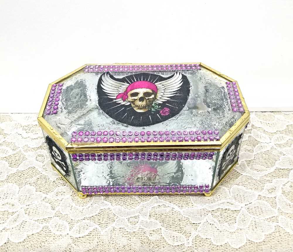 Beveled Cut Glass, Mirrored Jewelry Box with Purple Gem all around sides and a Fabric Skull with Wings