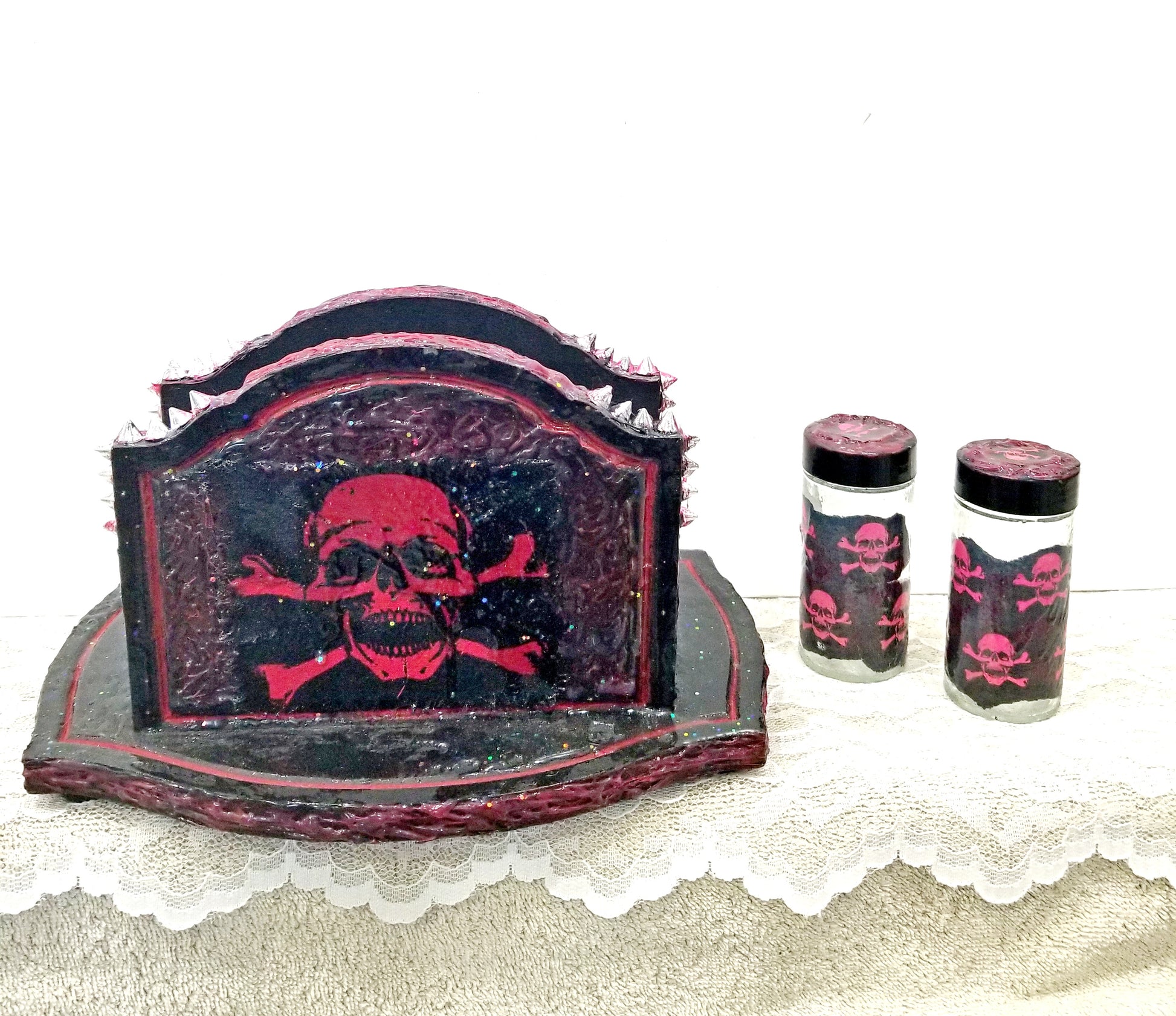Skull inspired Black & Red Napkin Holder with Salt & Pepper Shakers.