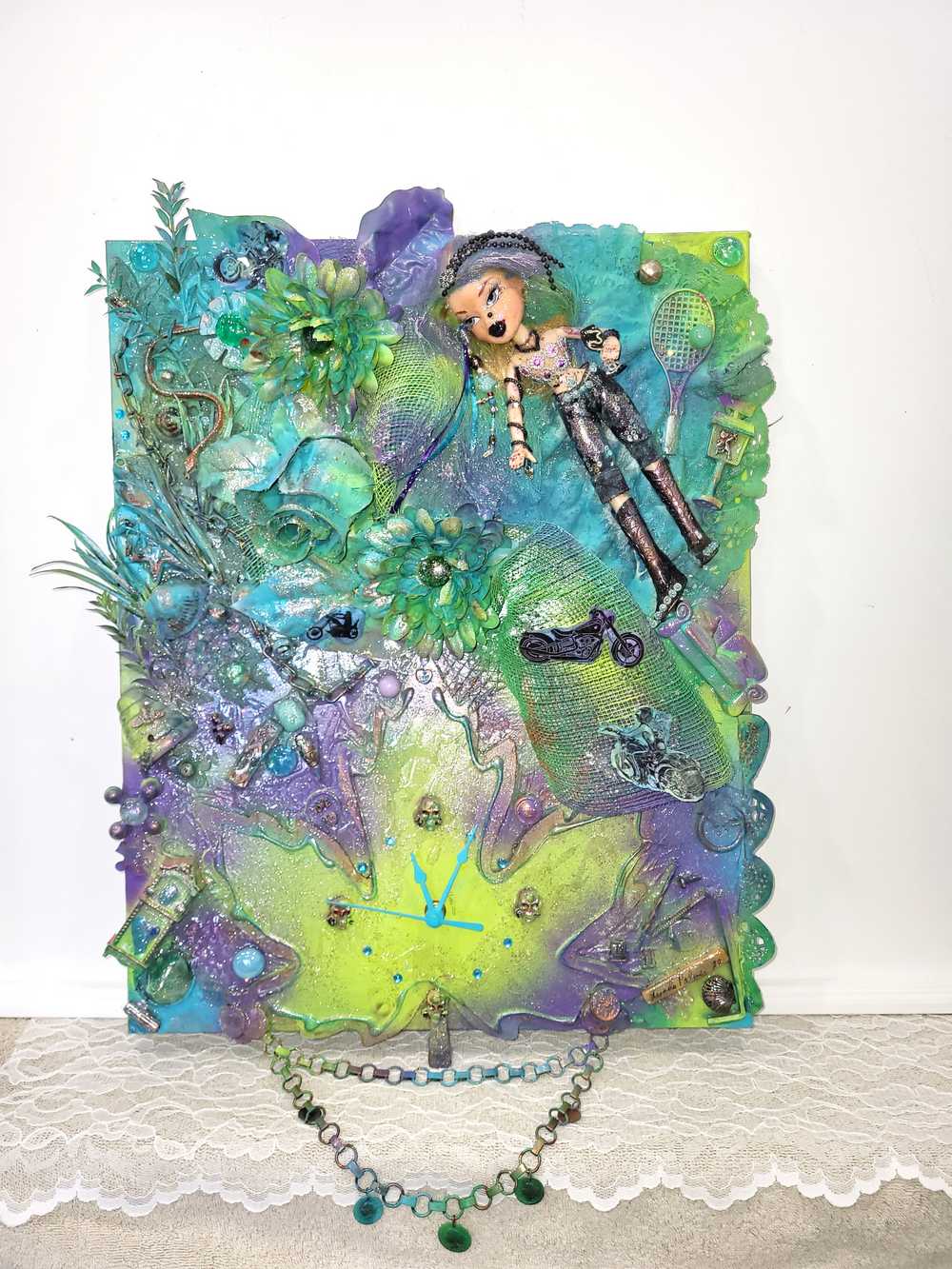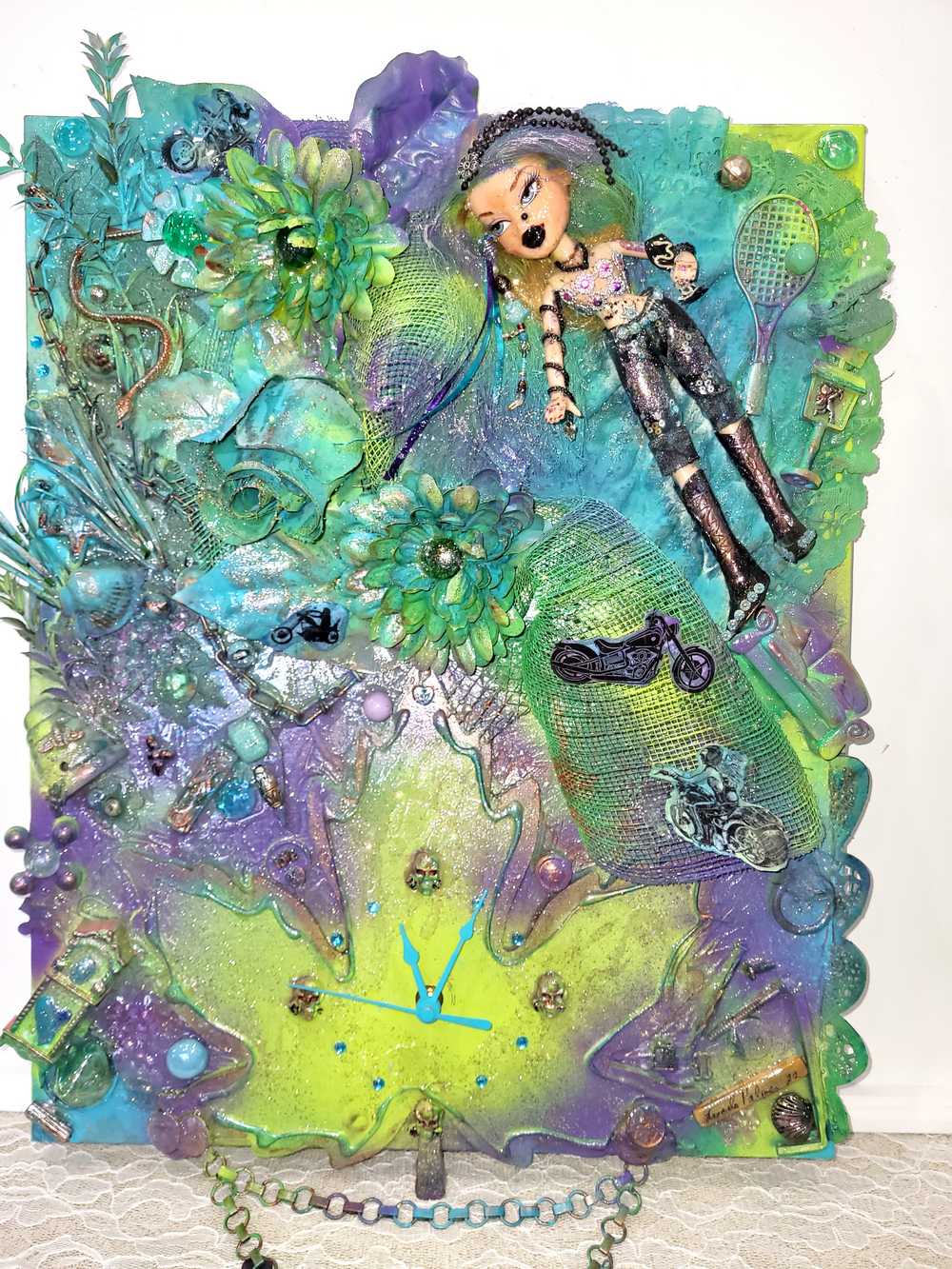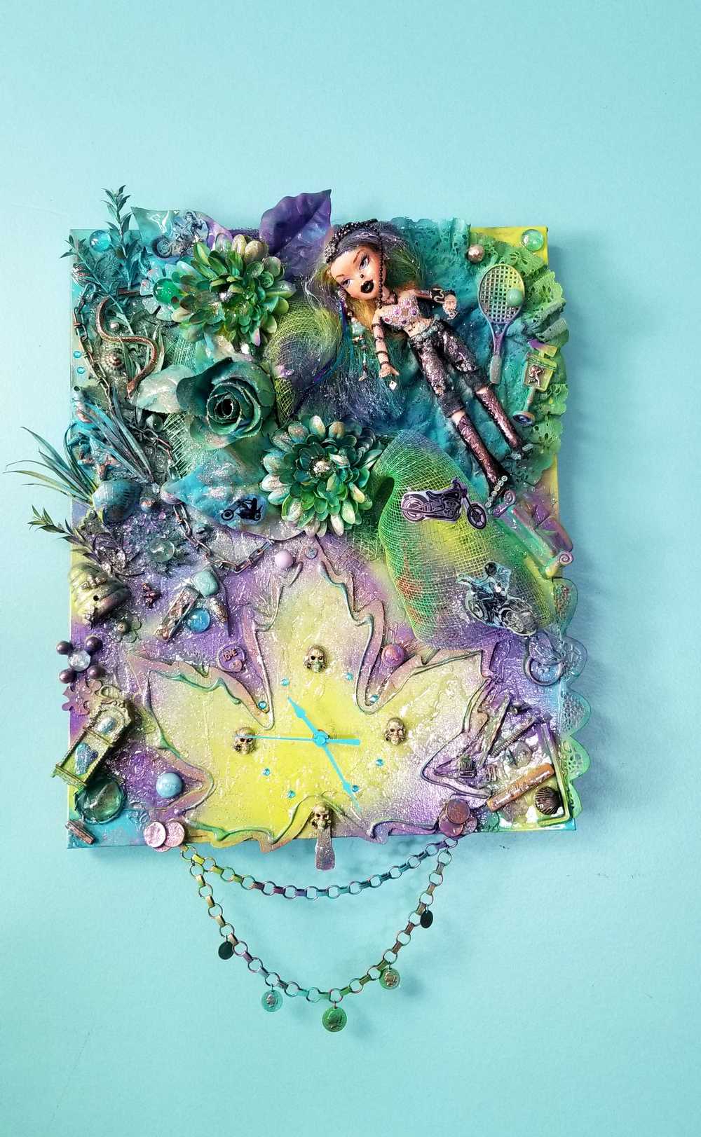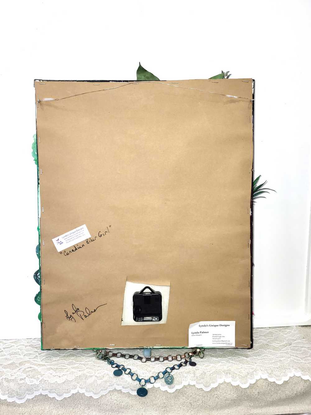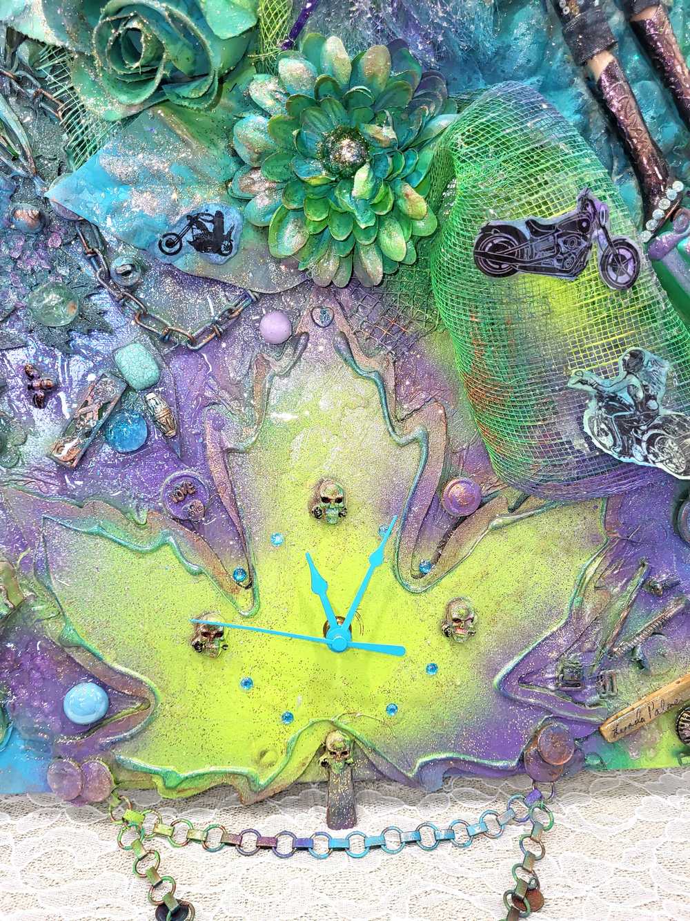 This Canadian-themed design CLOCK features a maple leaf cutout for the clock, adorned with Canadian pennies. The biker chick is portrayed in riding gear, sipping wine and relaxing after a long ride. She is also prepared for a game of tennis, with a purple and teal hair makeover, hair beads, makeup touch-ups, and added tattoos and piercings. The surrounding decor includes lace, dollies, mesh, tulle, chains, and flowers.