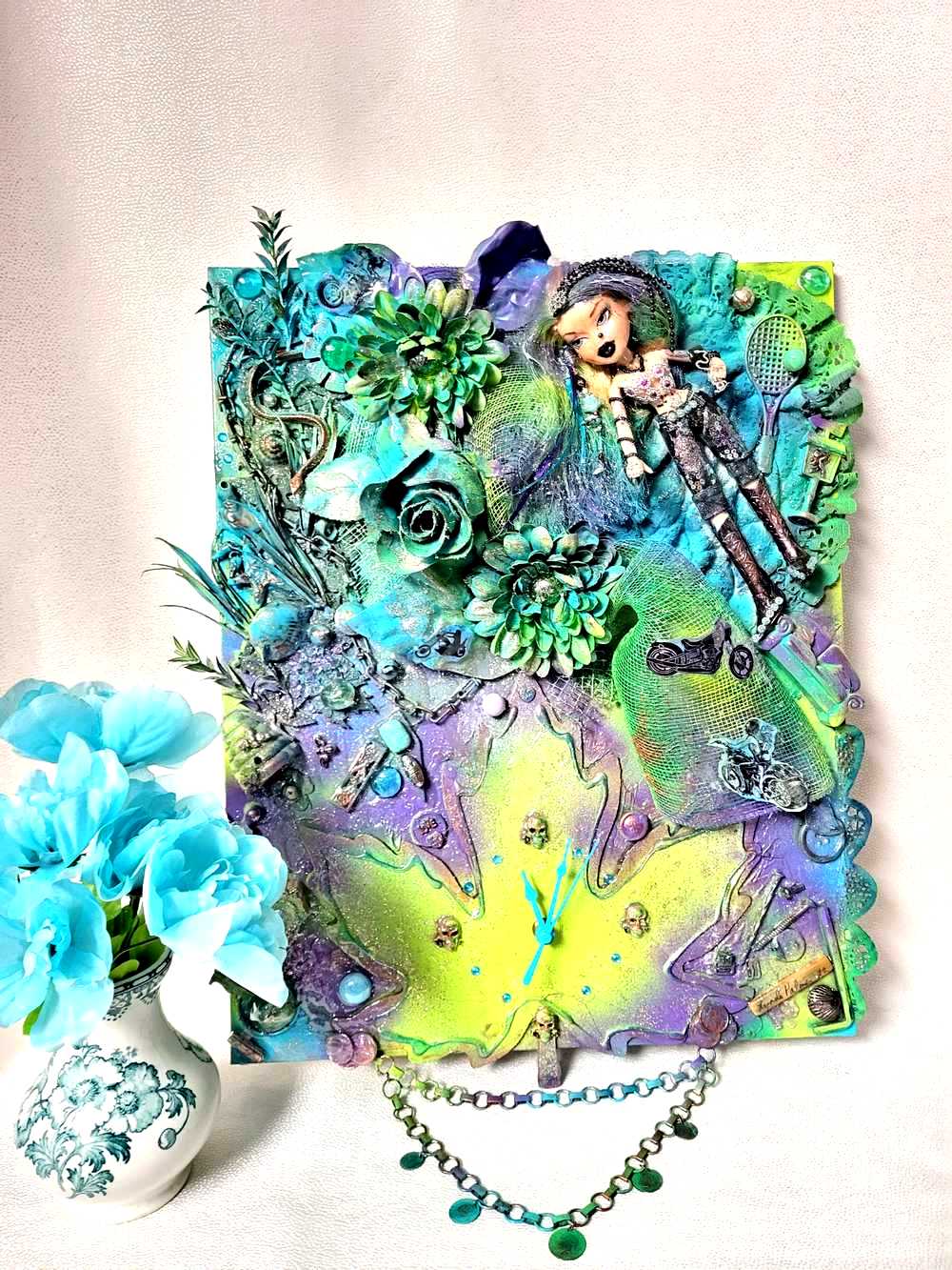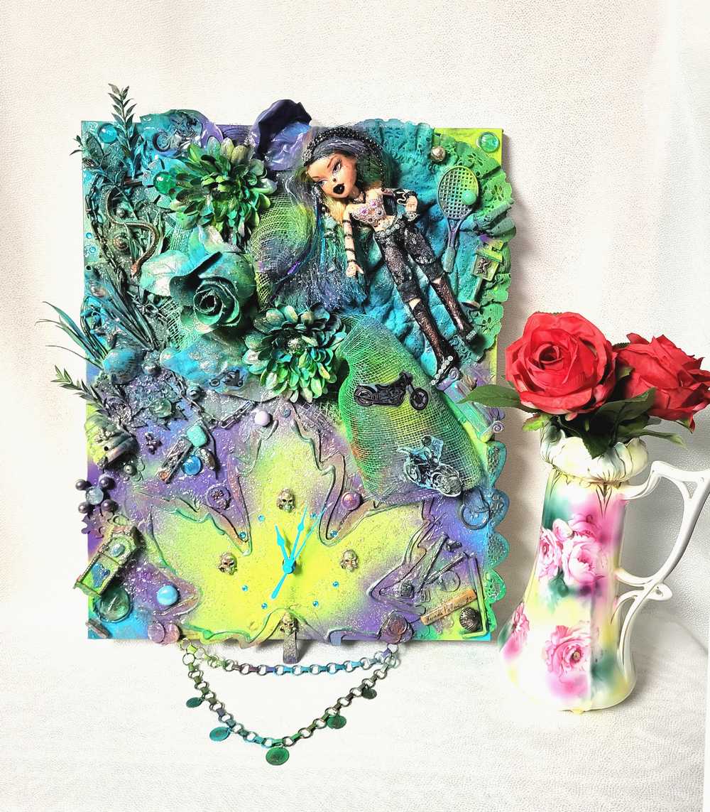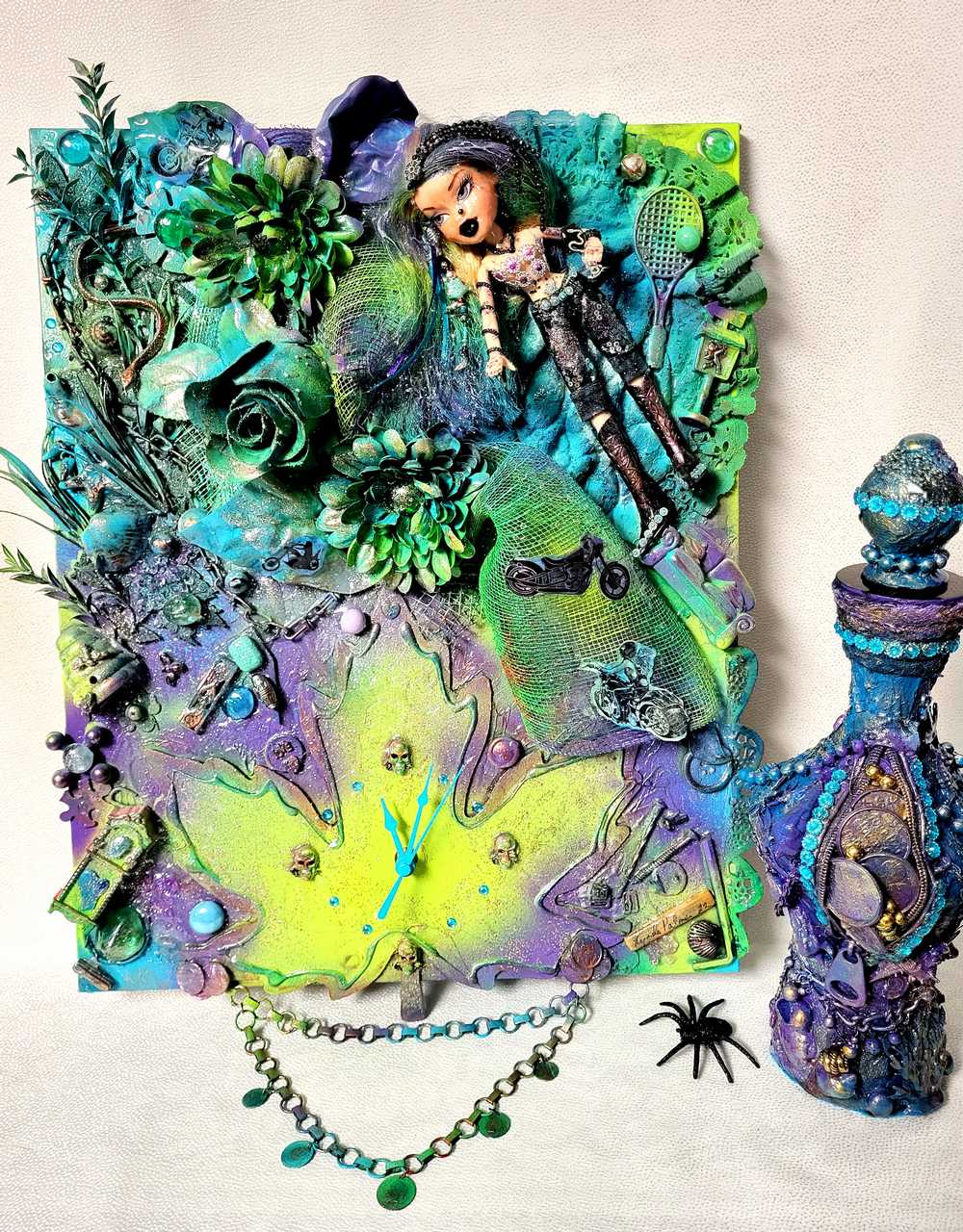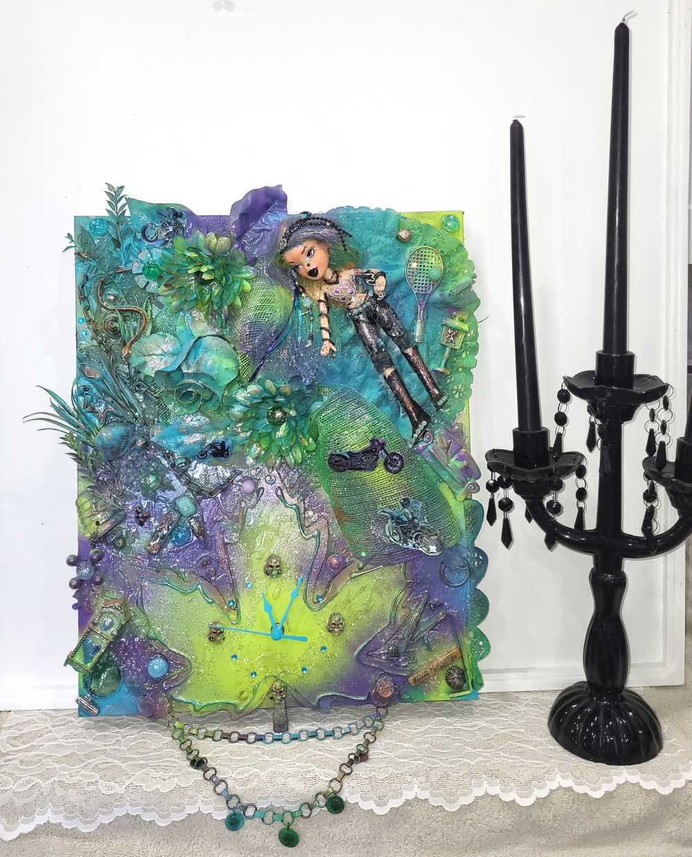 This Canadian-themed design CLOCK features a maple leaf cutout for the clock, adorned with Canadian pennies. The biker chick is portrayed in riding gear, sipping wine and relaxing after a long ride. She is also prepared for a game of tennis, with a purple and teal hair makeover, hair beads, makeup touch-ups, and added tattoos and piercings. The surrounding decor includes lace, dollies, mesh, tulle, chains, and flowers.