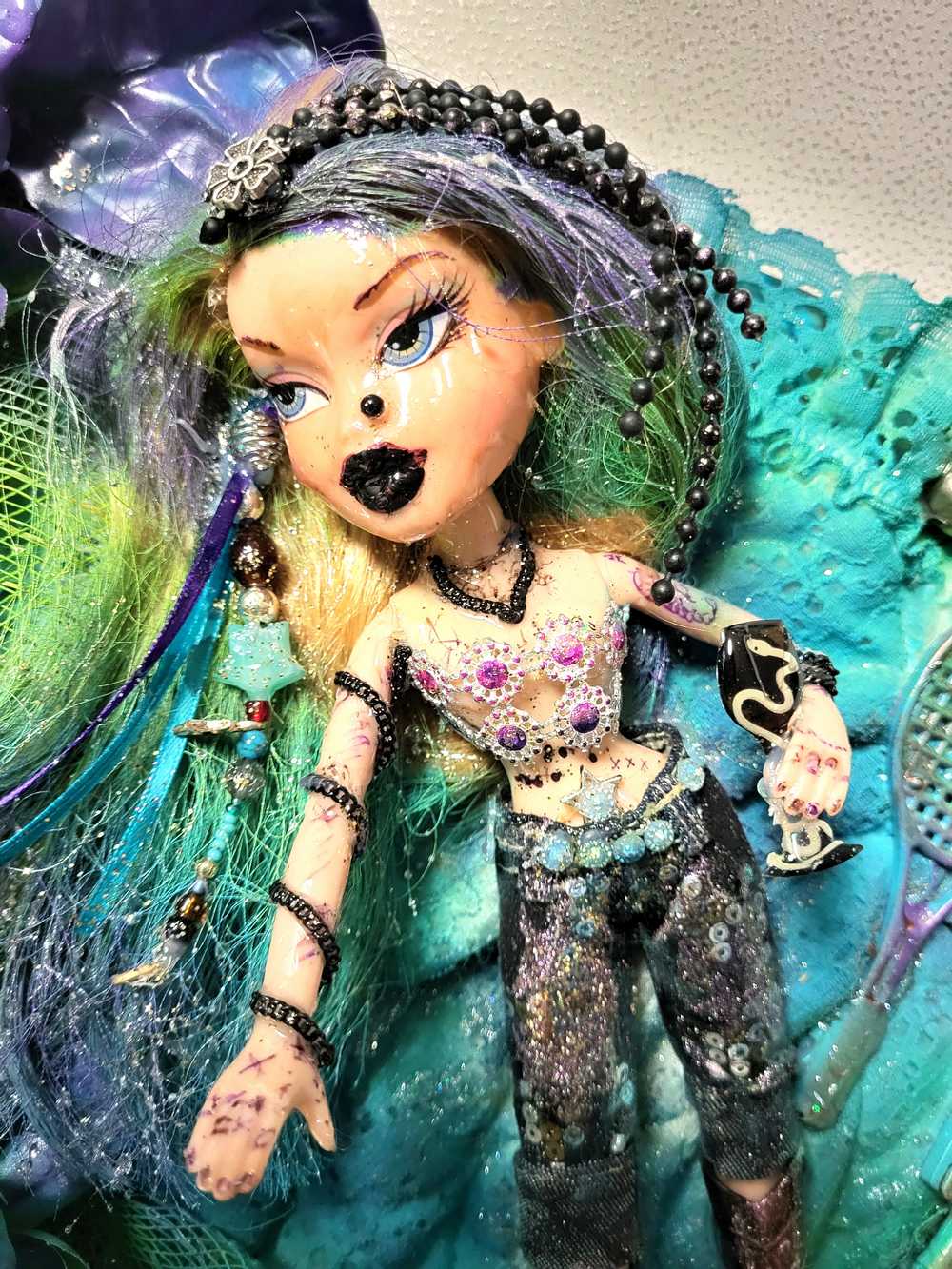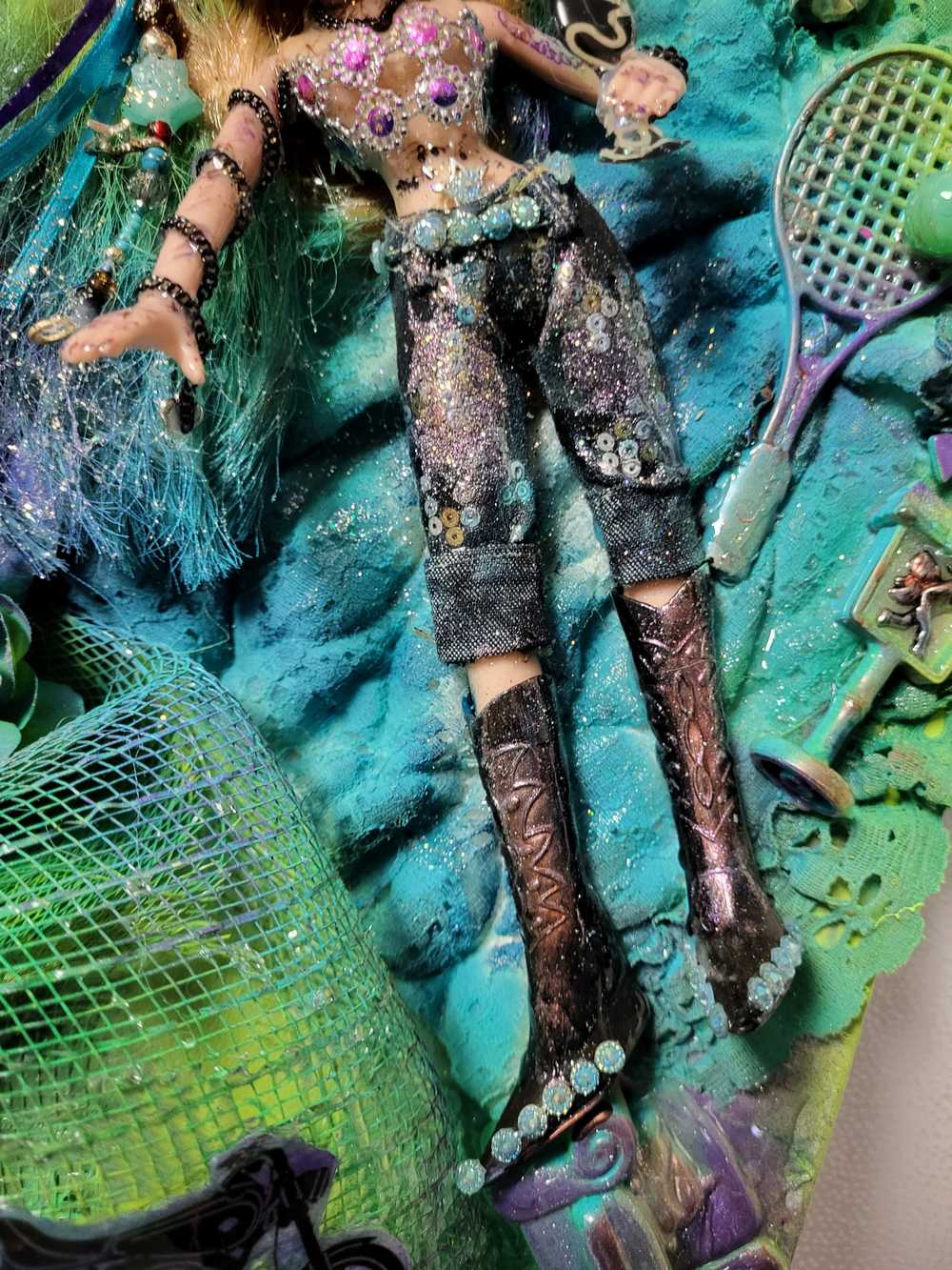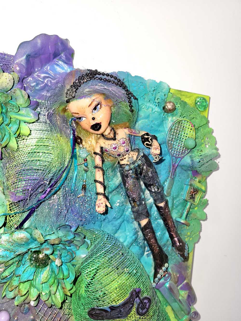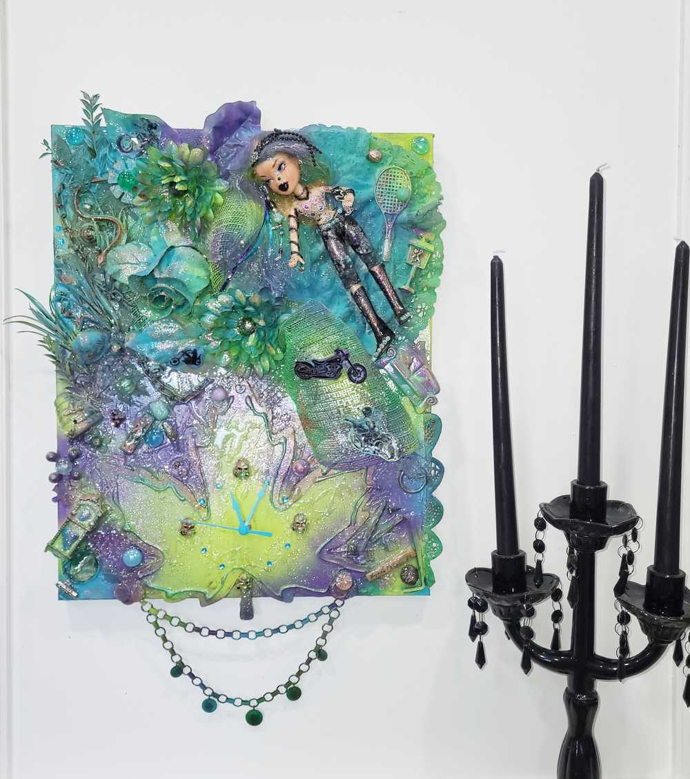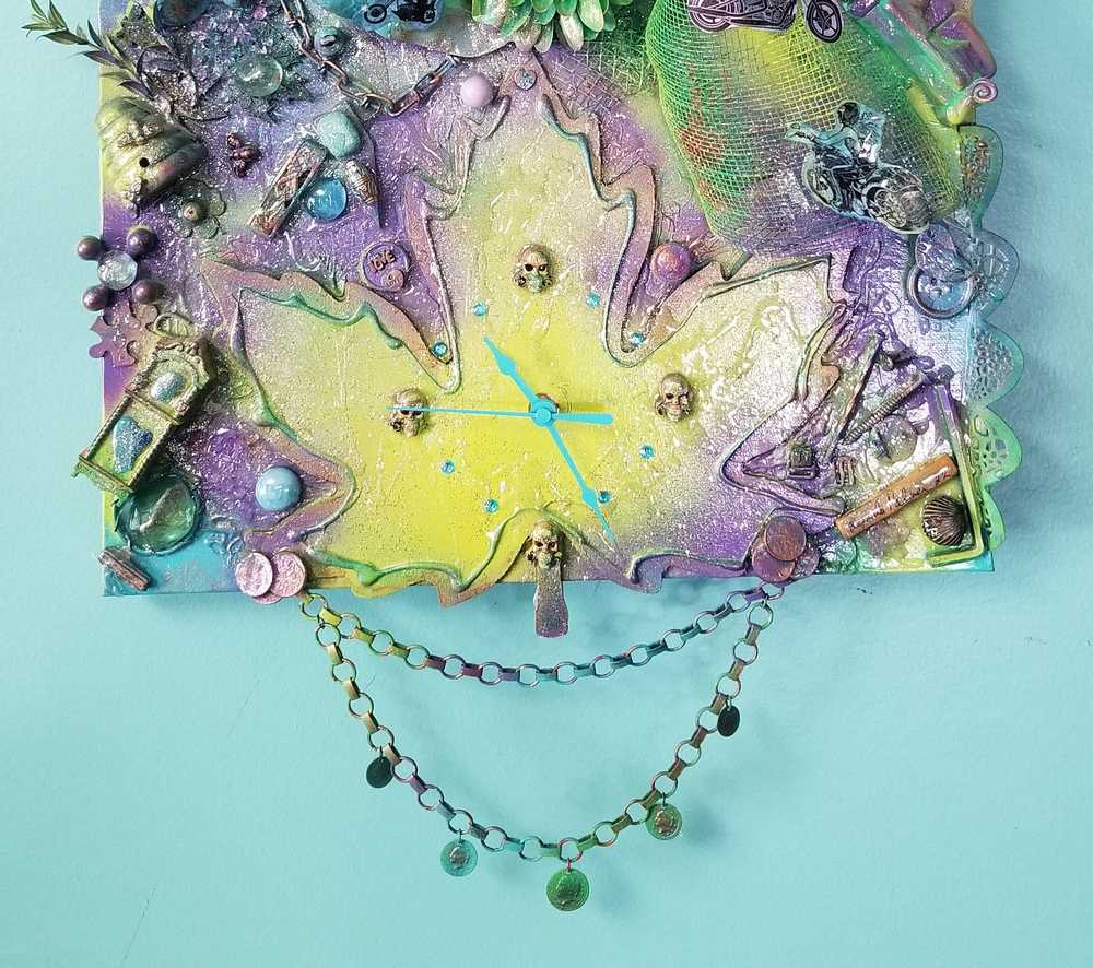 This Canadian-themed design CLOCK features a maple leaf cutout for the clock, adorned with Canadian pennies. The biker chick is portrayed in riding gear, sipping wine and relaxing after a long ride. She is also prepared for a game of tennis, with a purple and teal hair makeover, hair beads, makeup touch-ups, and added tattoos and piercings. The surrounding decor includes lace, dollies, mesh, tulle, chains, and flowers.