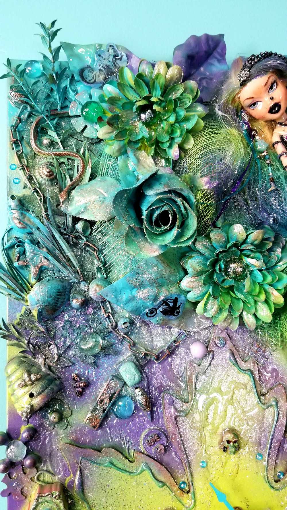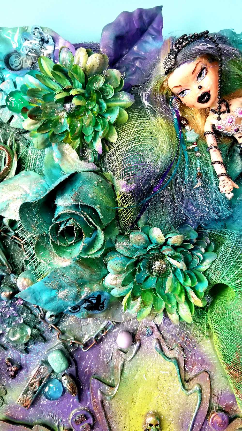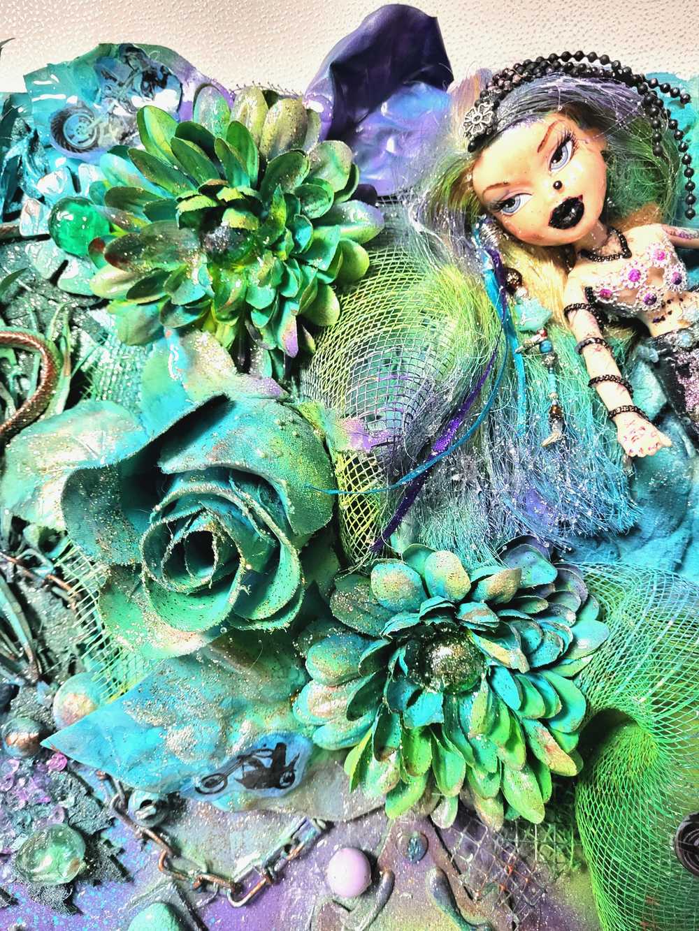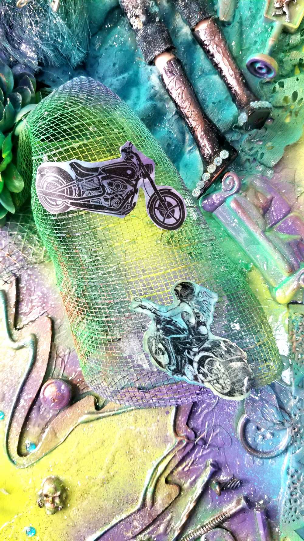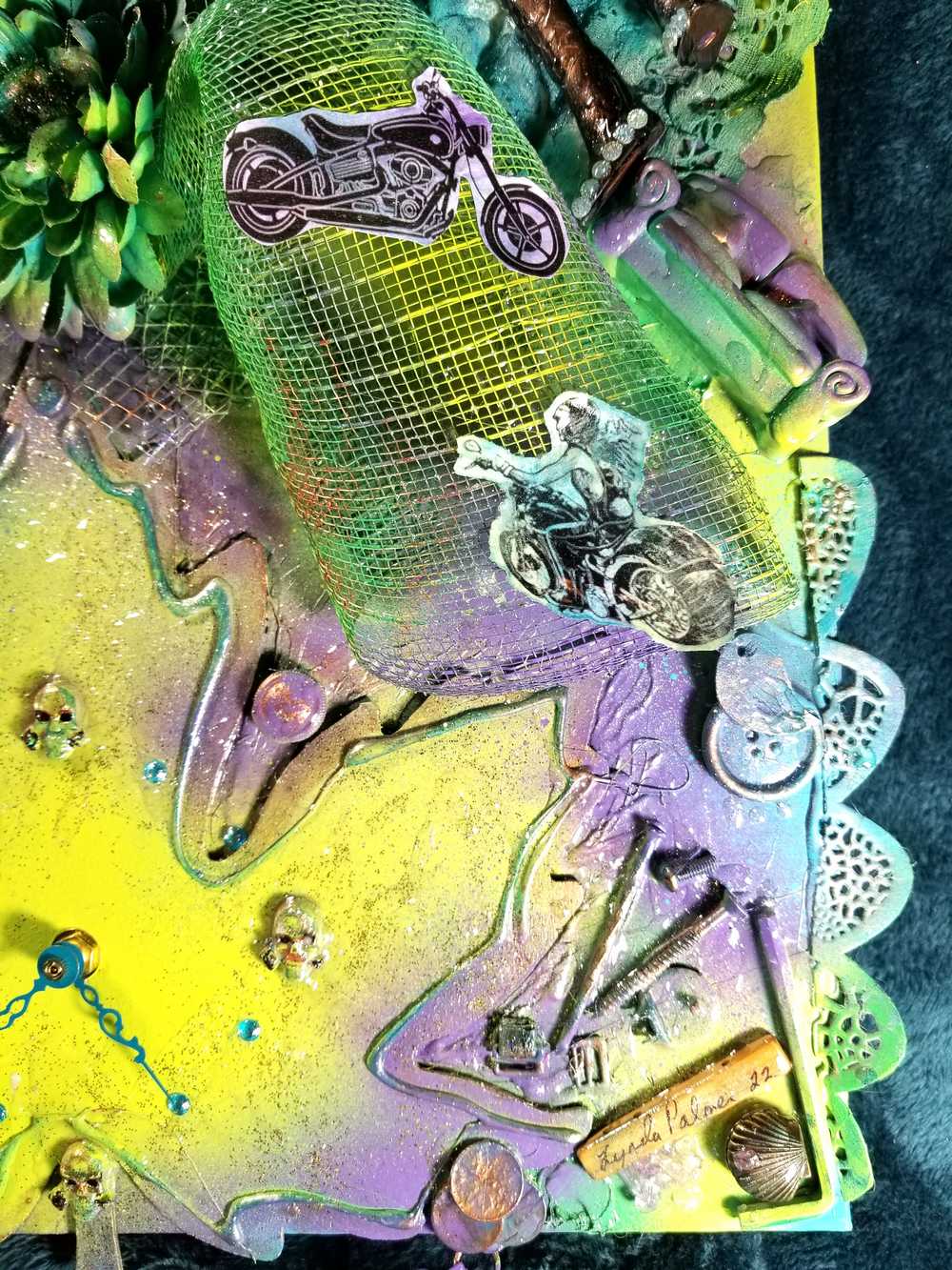 This Canadian-themed design CLOCK features a maple leaf cutout for the clock, adorned with Canadian pennies. The biker chick is portrayed in riding gear, sipping wine and relaxing after a long ride. She is also prepared for a game of tennis, with a purple and teal hair makeover, hair beads, makeup touch-ups, and added tattoos and piercings. The surrounding decor includes lace, dollies, mesh, tulle, chains, and flowers.