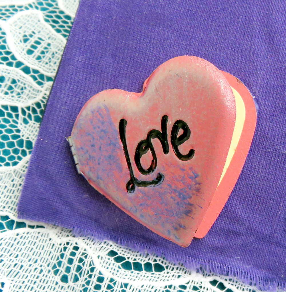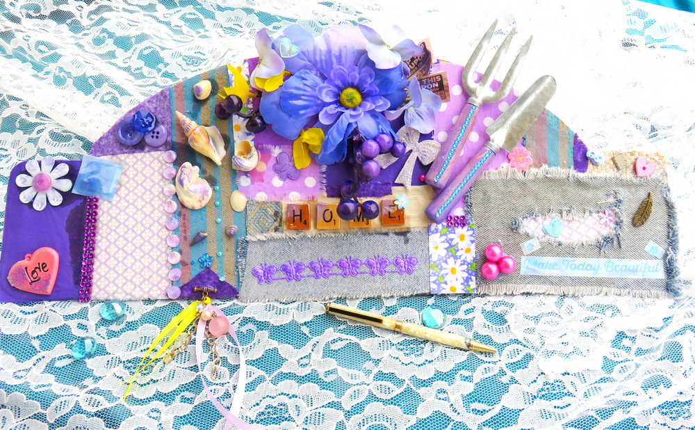 - Crafted from various textured and colored scraps of fabric, including a pair of distressed jeans, this unique wall plaque exudes a professional tone with its carefully chosen elements. A striking purple flower, accompanied by clusters of grapes and sunny yellow flowers, adds a touch of elegance to the piece. Adjacent to the flower, a garden fork and spade sit, perfect for the dedicated gardener. The words "HOME" and "MAKE TODAY BEAUTIFUL" are spelled out in wooden Scrabble tiles, while sea shells, buttons, hearts, flowers, butterflies, and ticket stubs add interest and dimension to the artwork. A recycled chain serves as a sturdy hanger, while a metal heart-shaped frame bearing the word "LOVE" allows for the addition of cherished photos. The bottom is adorned with a lovely charm, featuring ribbons and pearls.