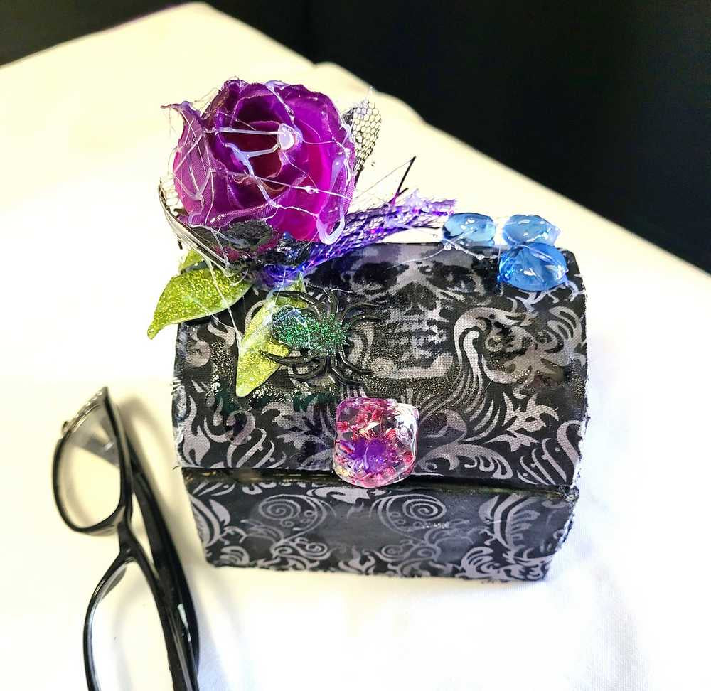 Hump Back Jewelry, Stash, Trinket Box, Covered with Black Skull Fabric, a Purple Rose, Blue Glass Cabochons, Spider,