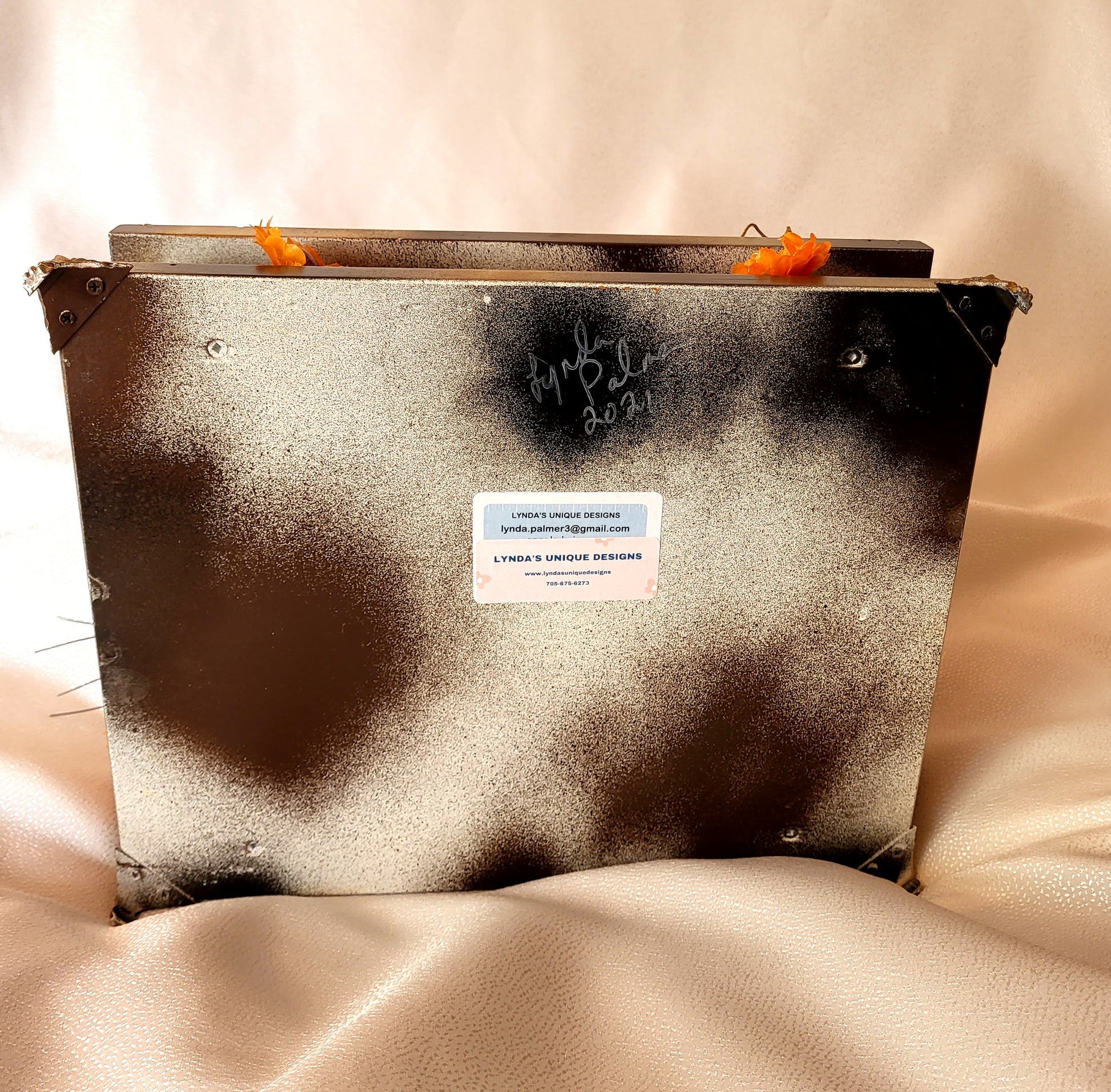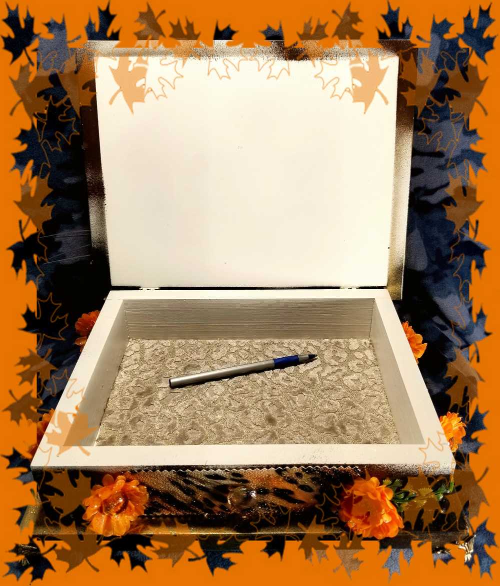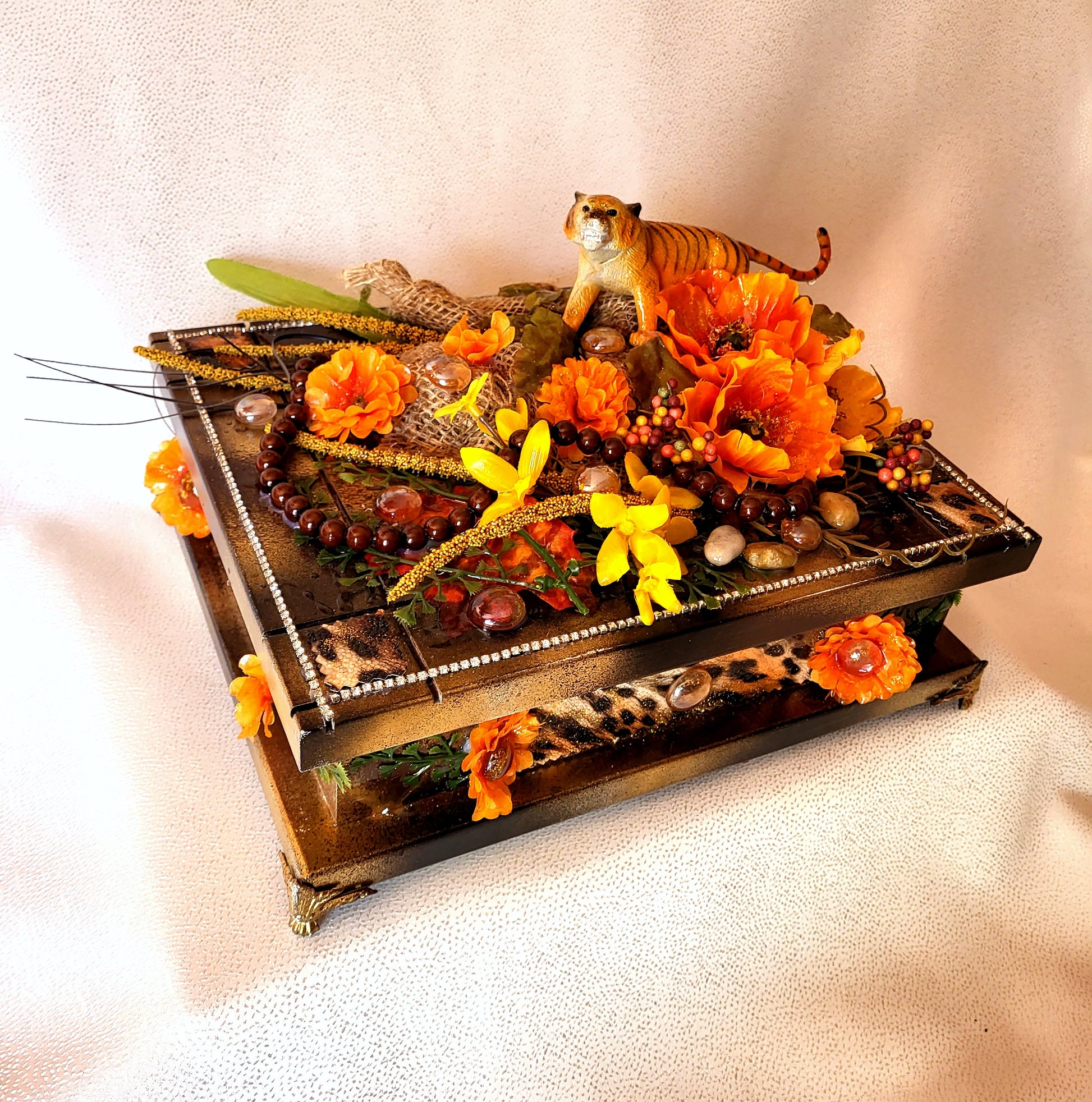 Let your wild side take charge as you witness the bold and daring display of luxurious orange, gold, brown, and bright yellow flowers that will bring life and vibrancy to any room. Adorned with animal fabric pieces on each corner and sides, and sparkling crystal clear rhinestones along the top, this jewelry box is a true masterpiece. The center is adorned with stunning orange flowers and clear glass cabochons, adding to its exotic appeal. Perfect for holding all your treasures and trinkets, this hinged box with metal decorative feet is a must-have for any risk-taker. Don't miss out on owning this captivating piece!