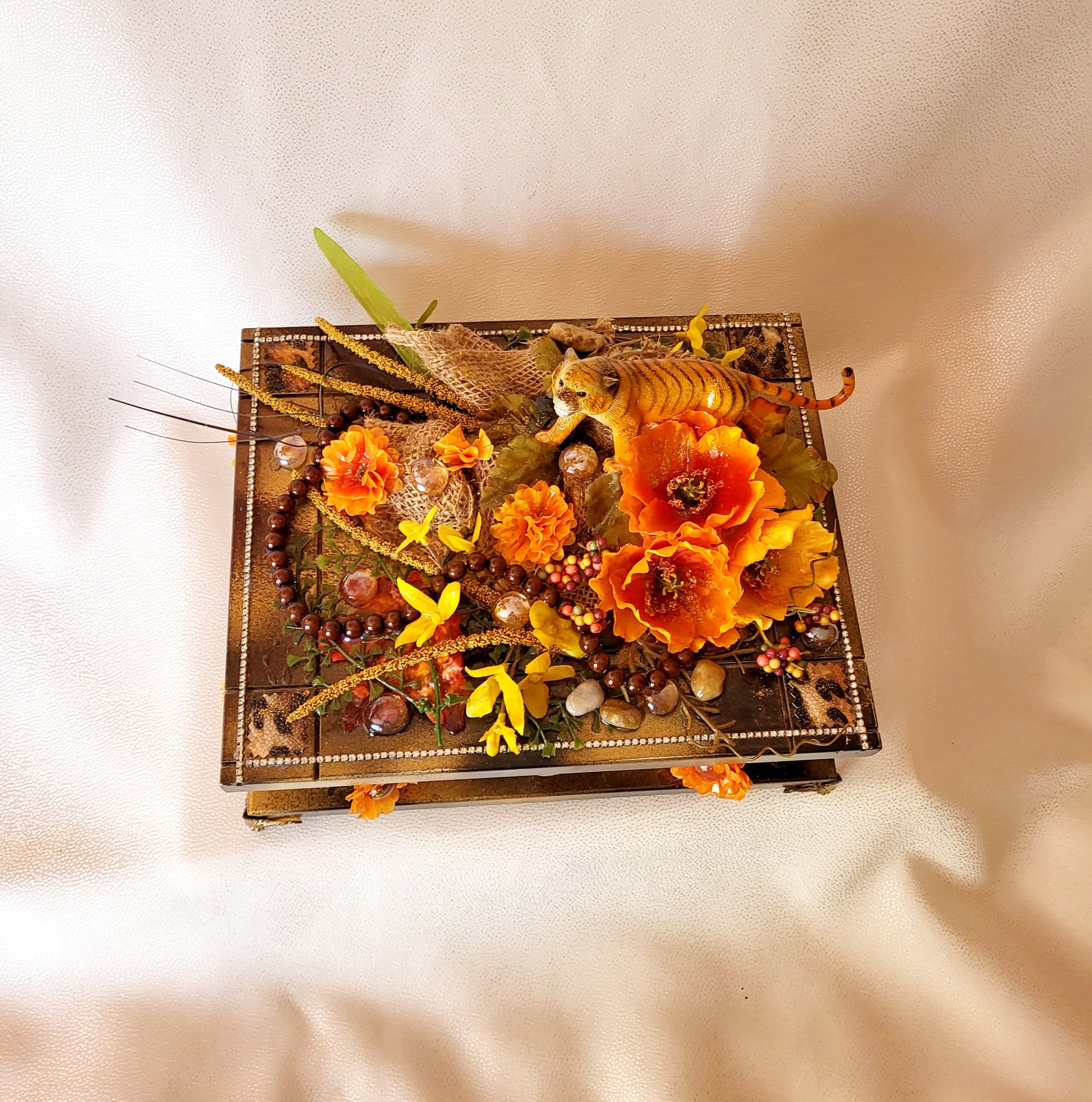 Jewelry Box with Orange & Yellow Flowers and a Tiger, Safari Themed