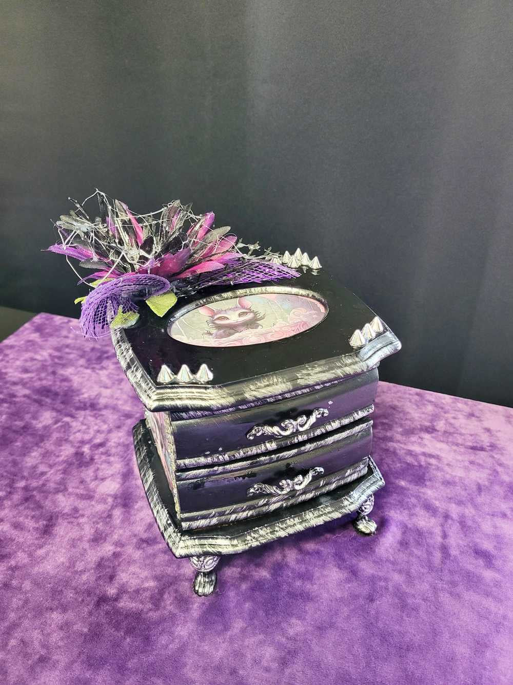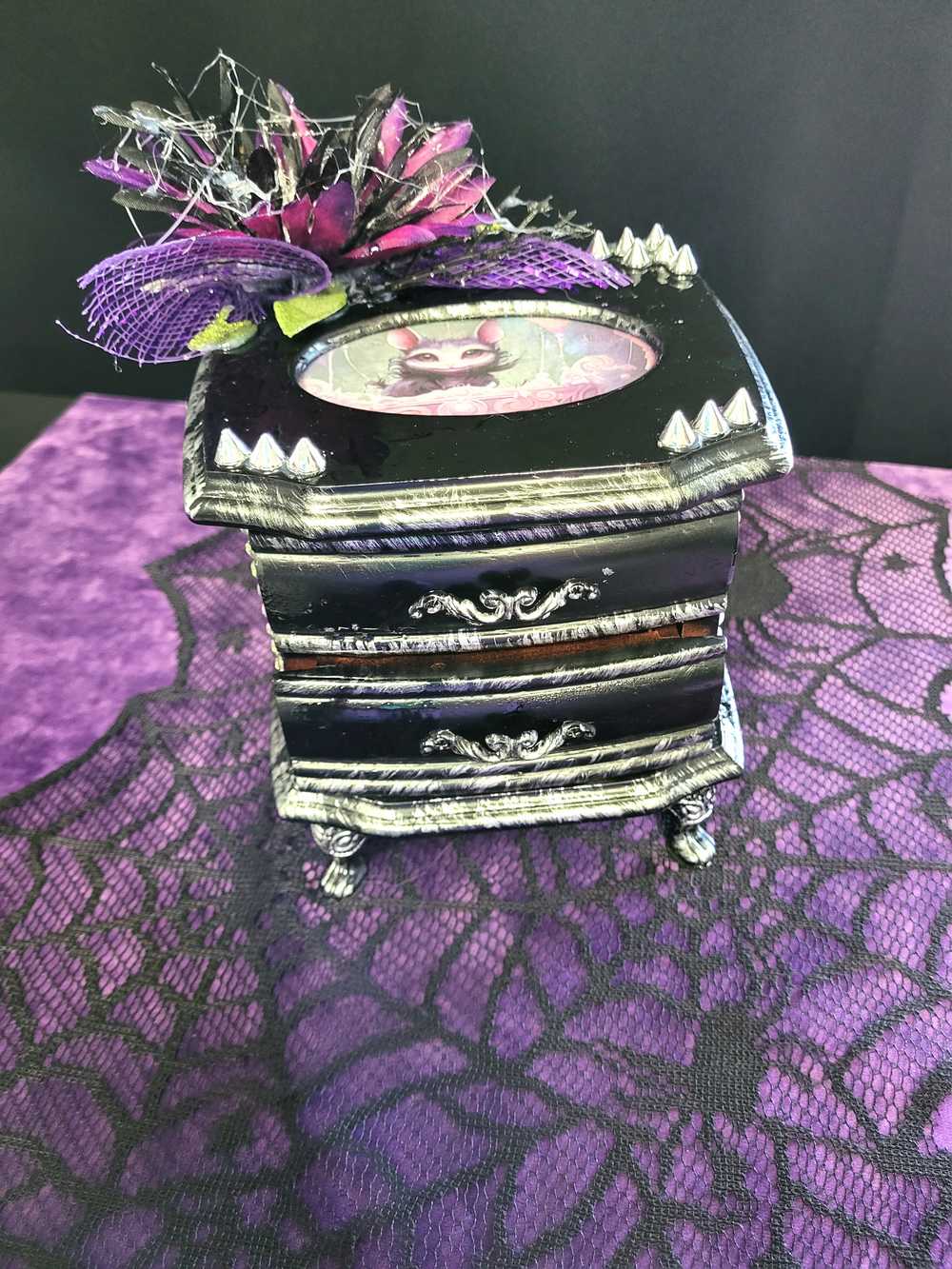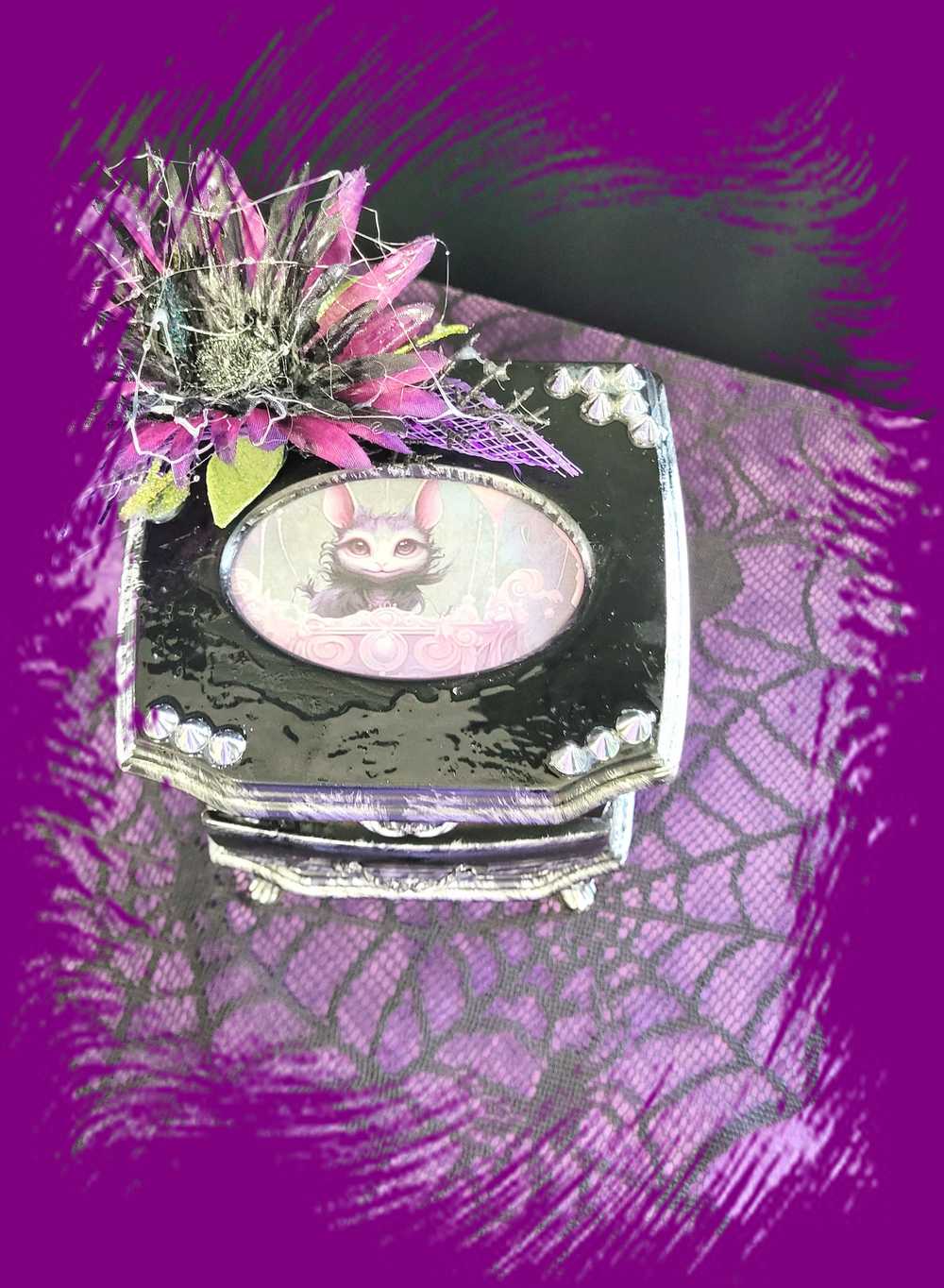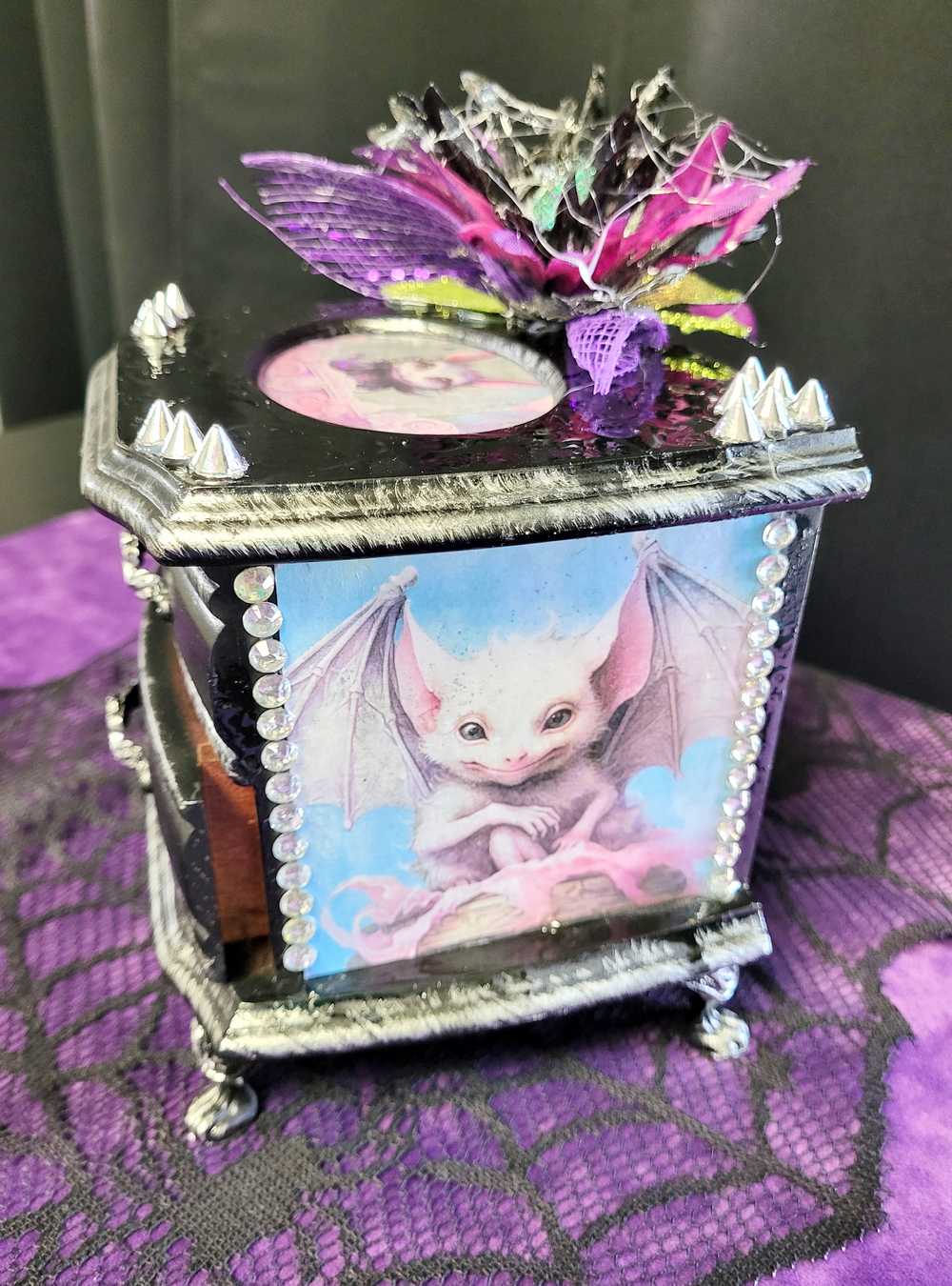 Musical Jewelry Painted Black With Baby Bats, Black & Purple Flower and Silver Spiked Domes