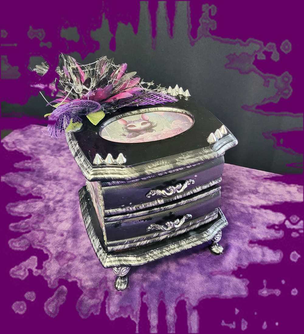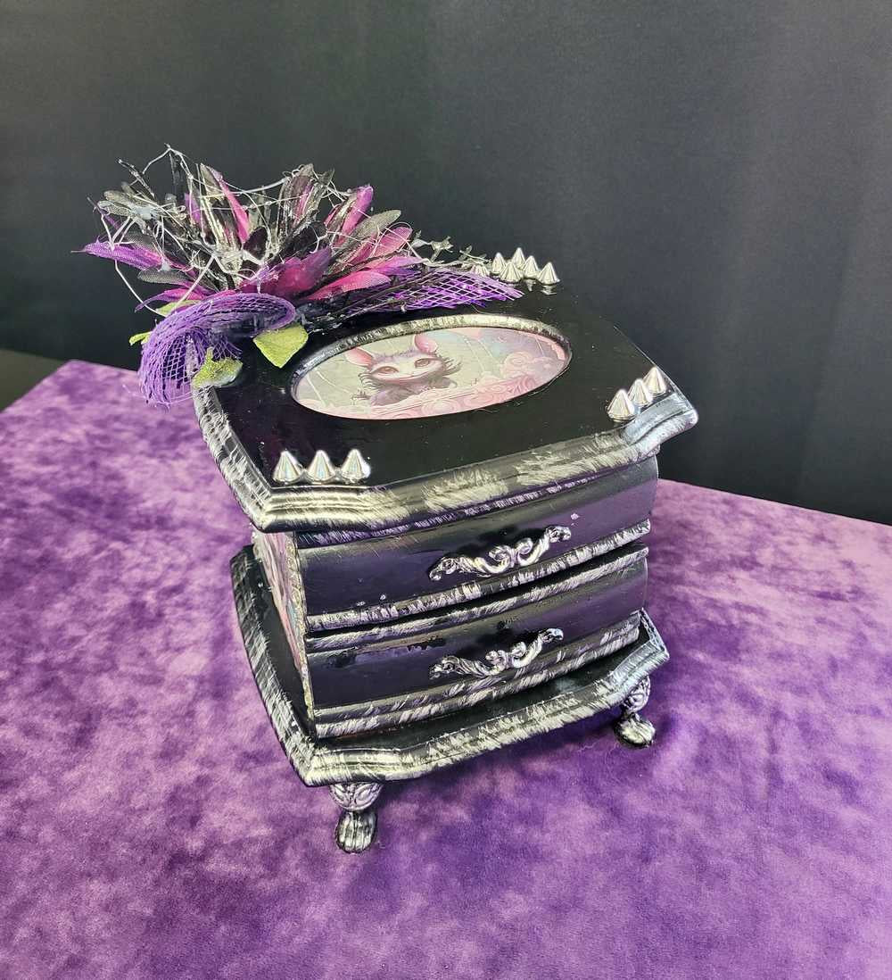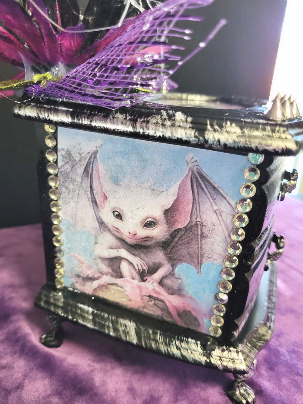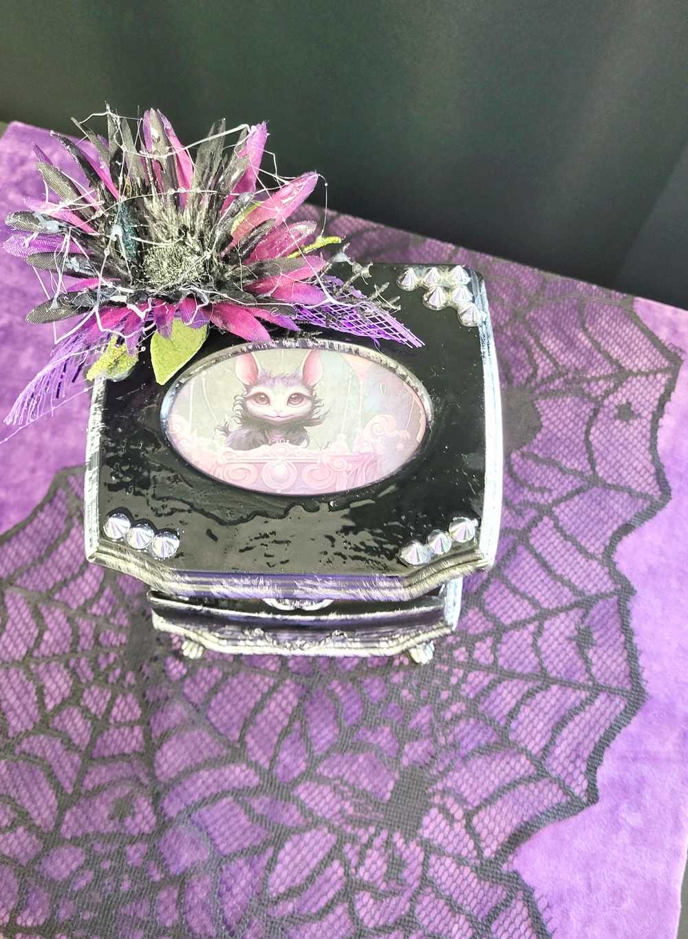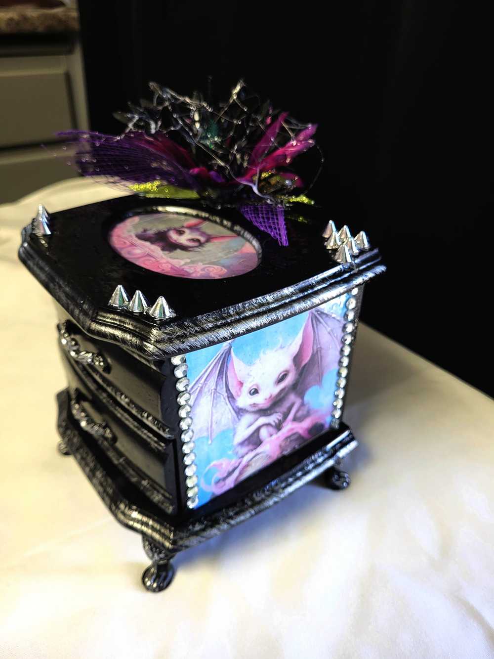 Musical Jewelry Painted Black With Baby Bats, Black & Purple Flower and Silver Spiked Domes