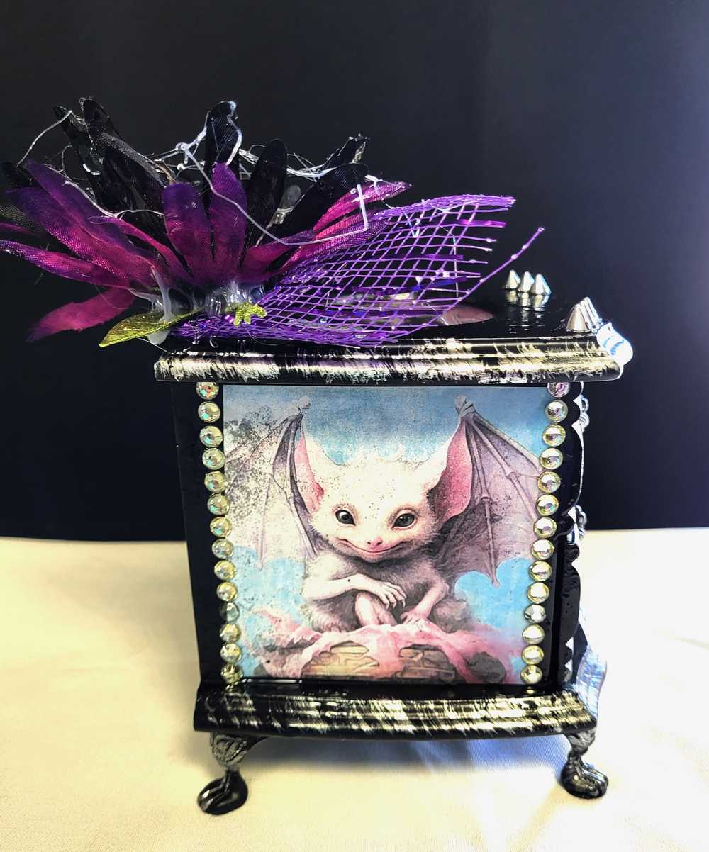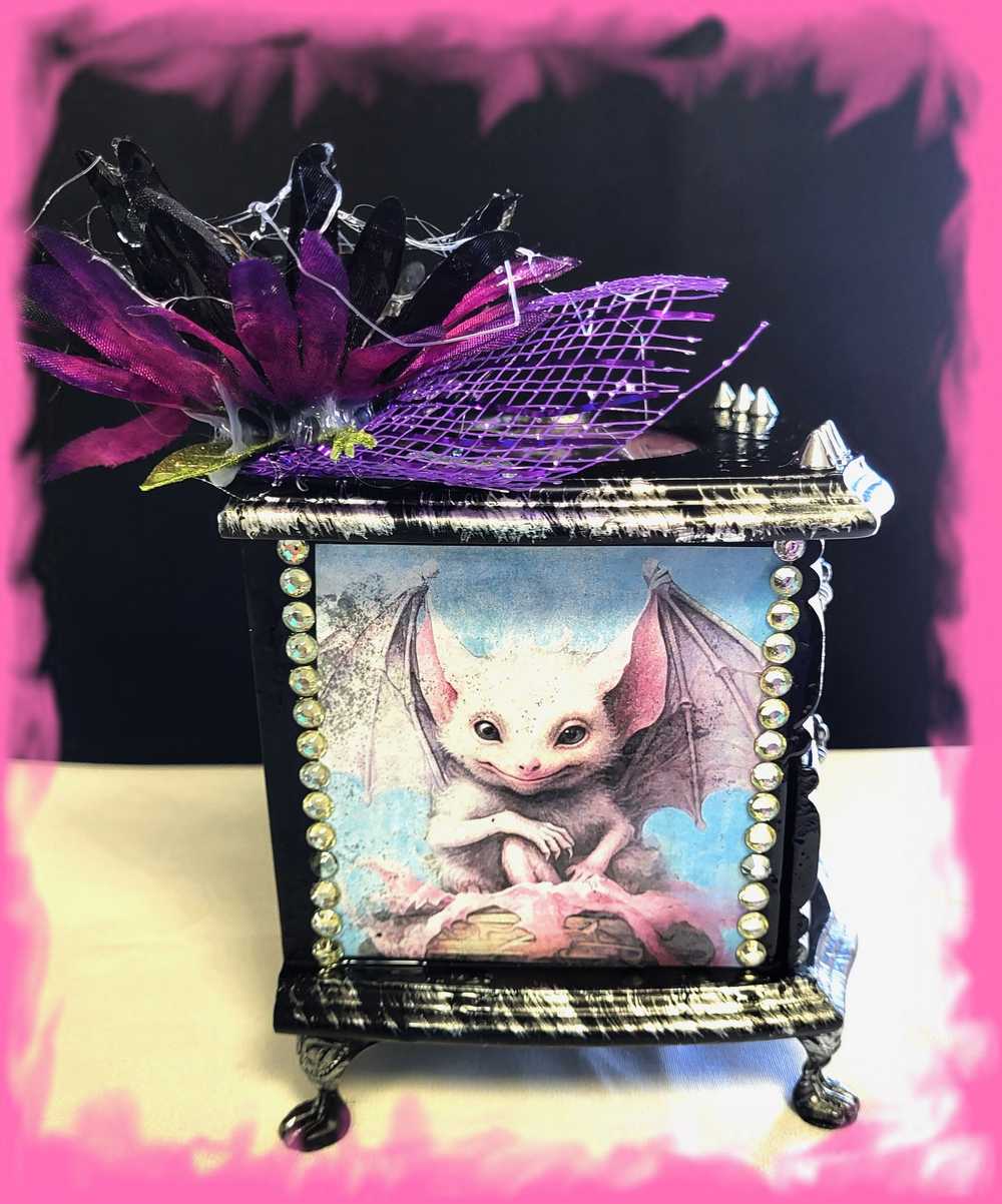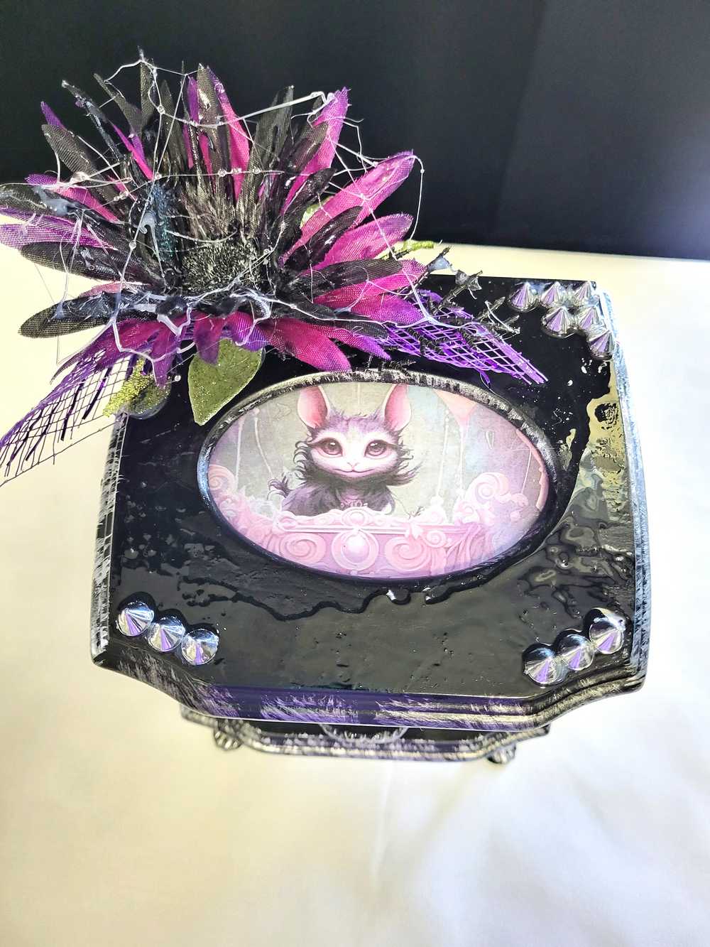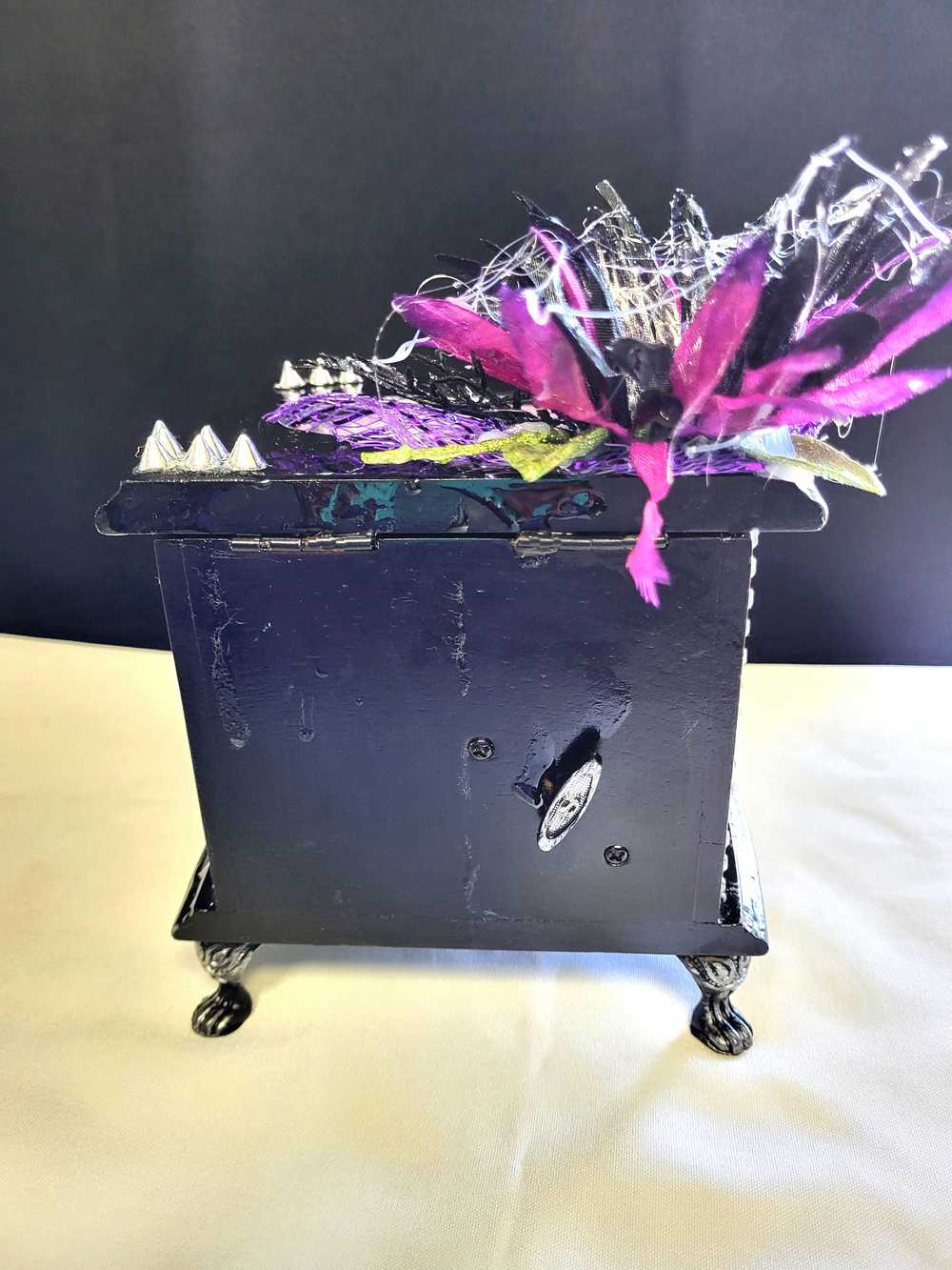 Musical Jewelry Painted Black With Baby Bats, Black & Purple Flower and Silver Spiked Domes