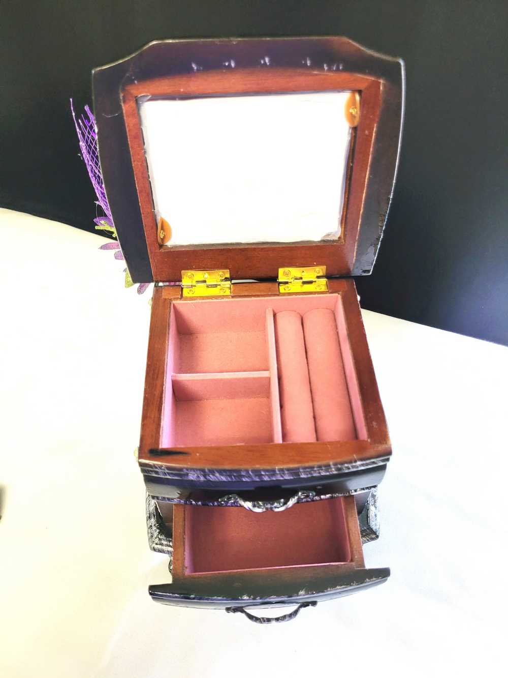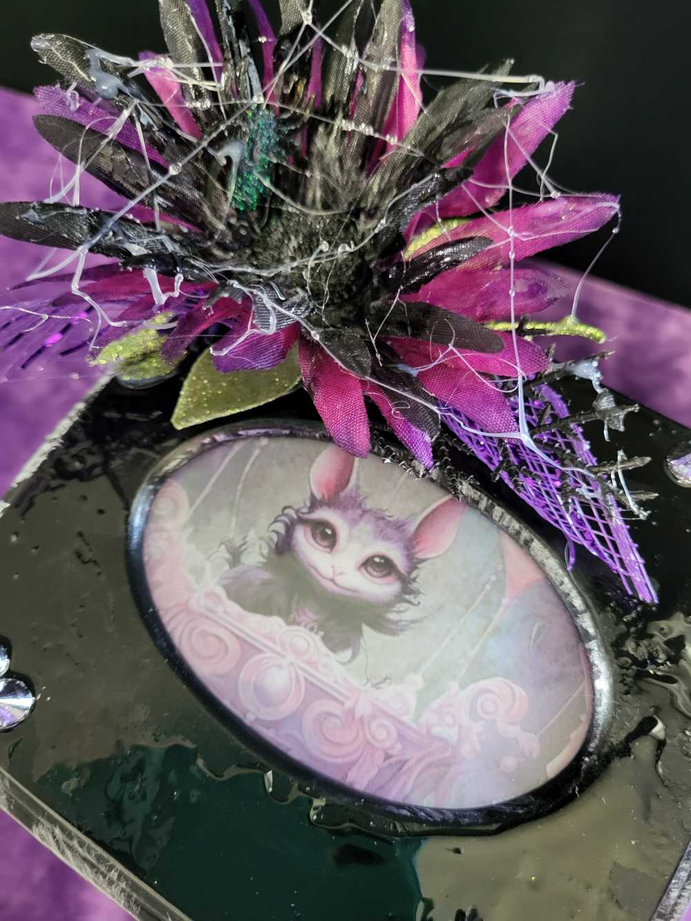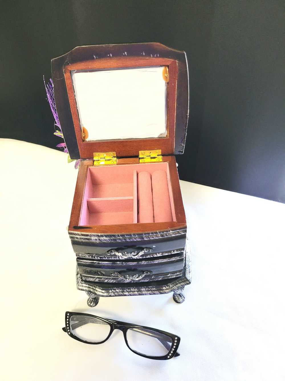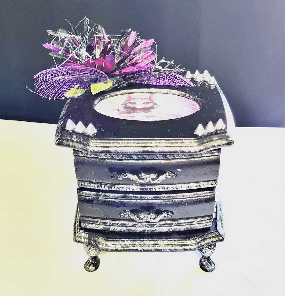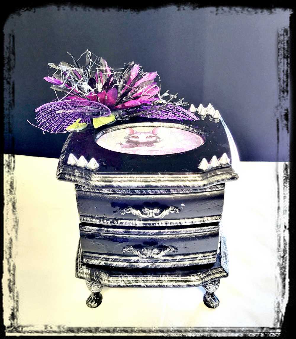 Musical Jewelry Painted Black With Baby Bats, Black & Purple Flower and Silver Spiked Domes