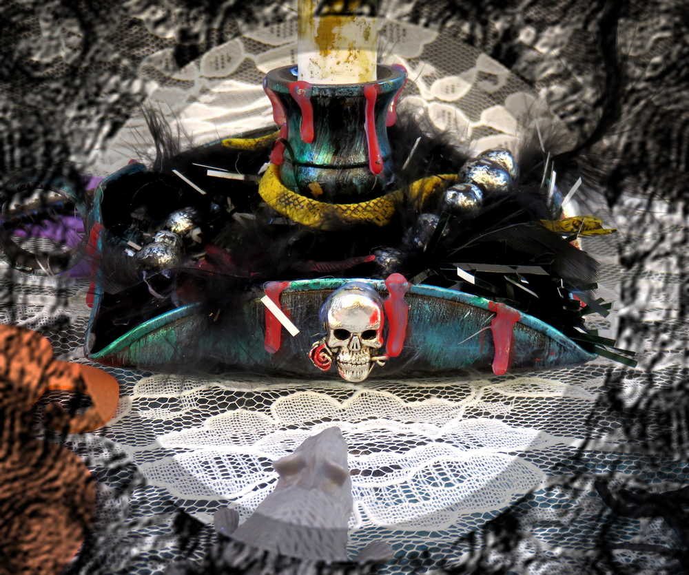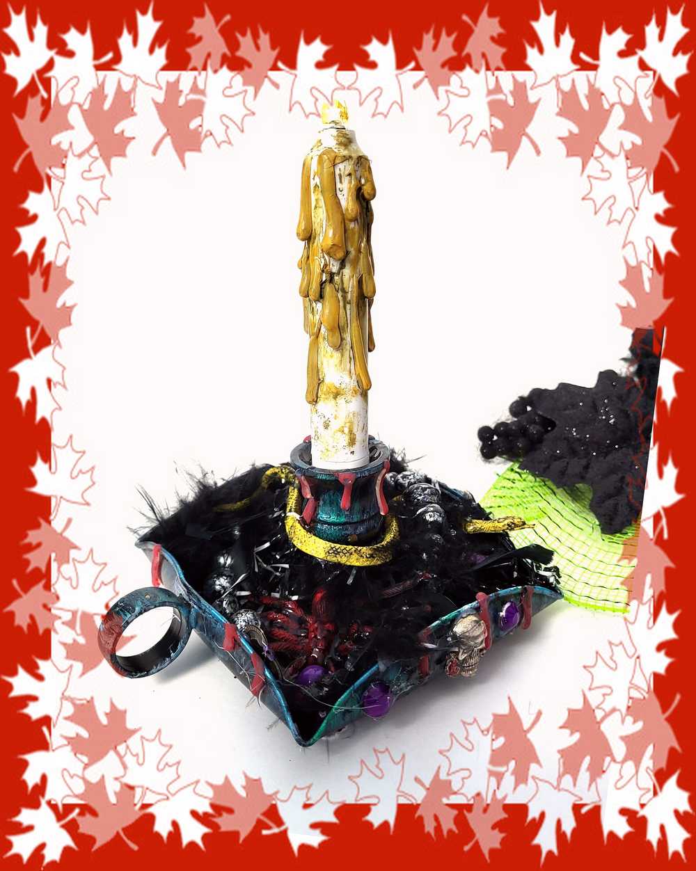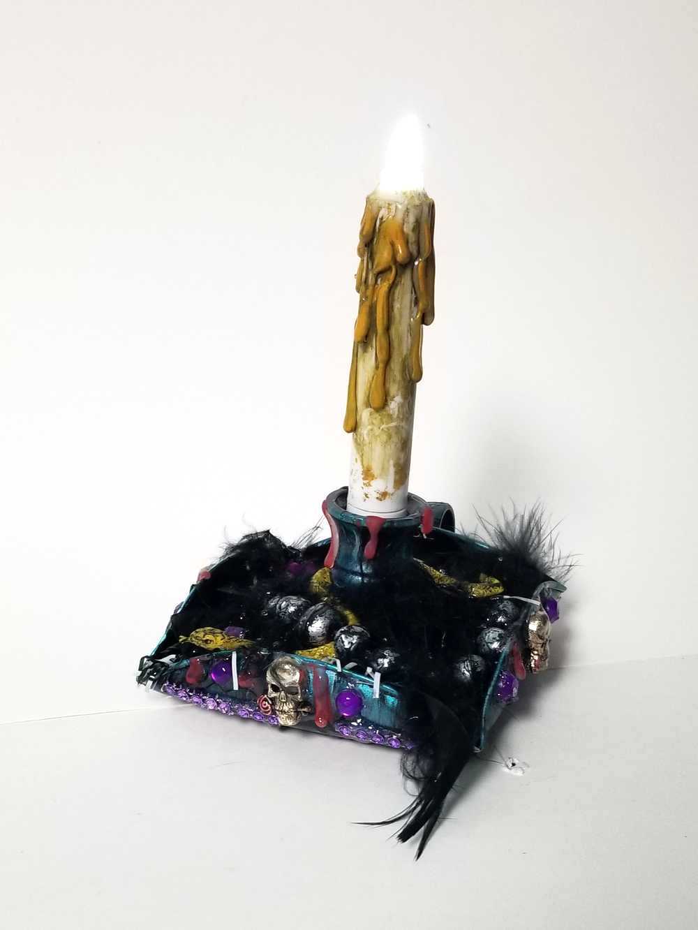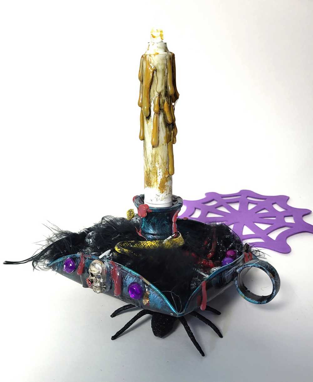 This exquisite candle holder, designed for battery-operated candles, includes 2 AA batteries and can be easily unscrewed for convenient battery replacement. To open the candle, simply loosen its grip. This alluring candle holder exudes a sense of mystique, adorned with black feathers, spiders, and skulls. Its charming finger hold adds a touch of nostalgia that harkens back to days of old.