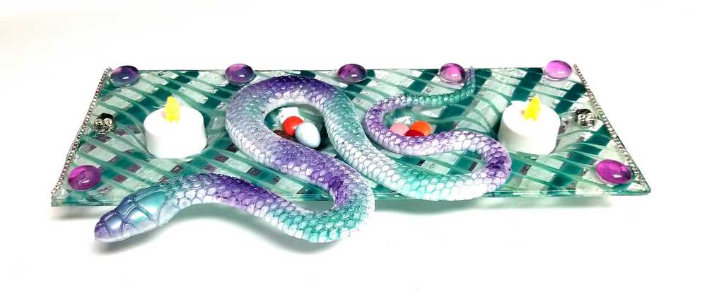 Teal & Purple Glass 4 Candle Holder with Resin Snake, Candy Dish