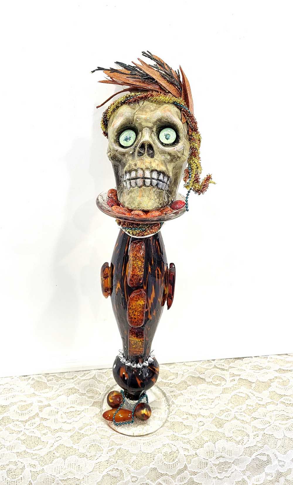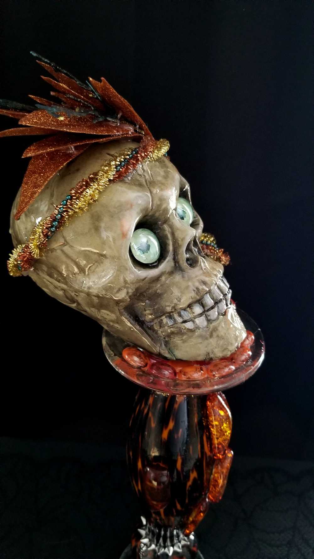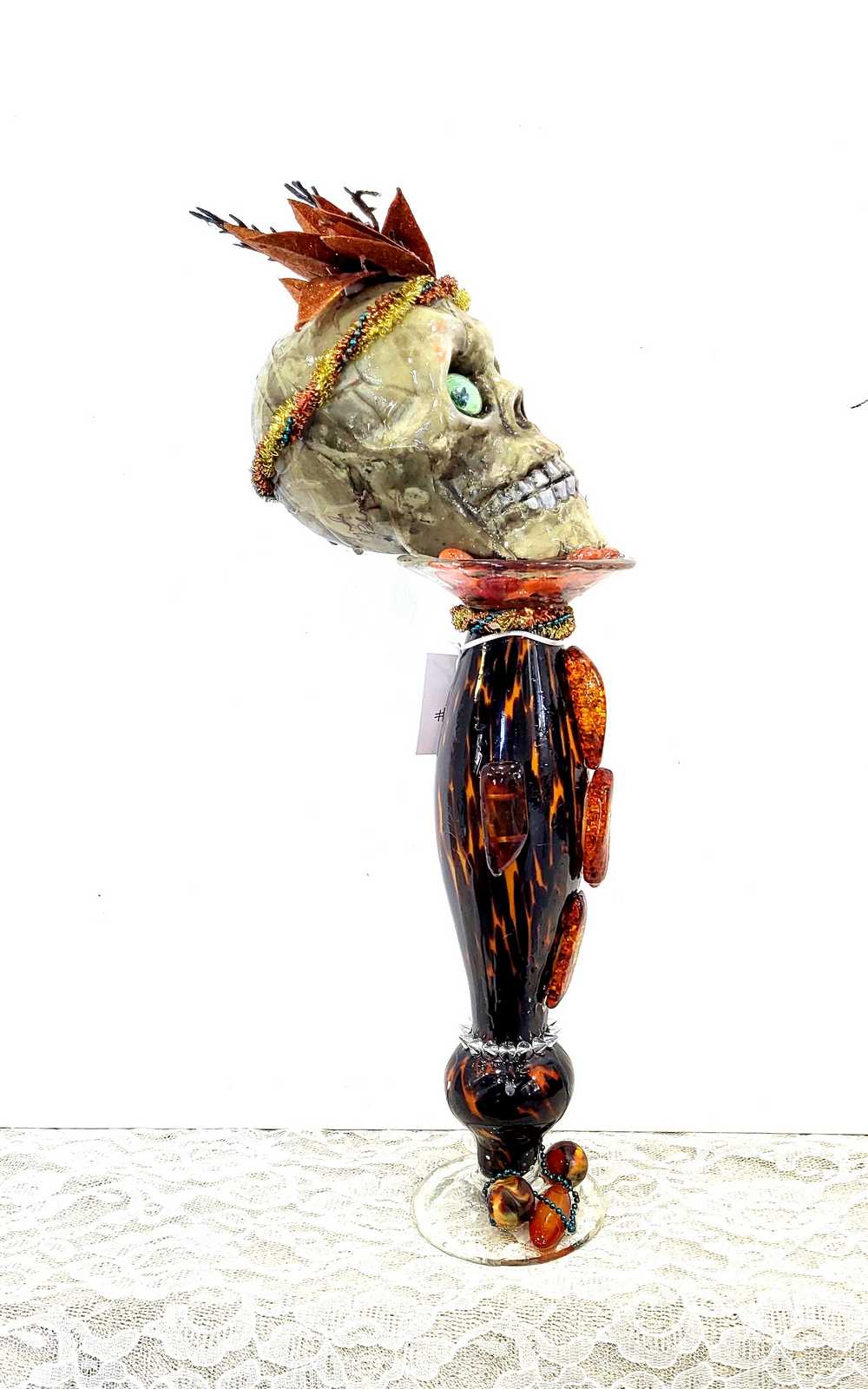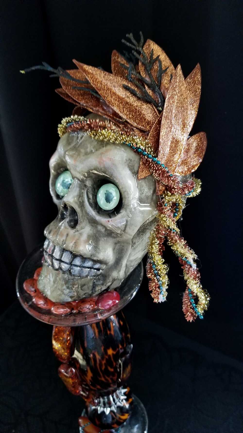 Get wild with this stately and stunning Ellegant Tiger Glass Skull featuring rich black and orange colors, decked out with Silver Studs and Large Amber Beads. Her gold and copper headdress sports a funky teal headband adorned with black sticks and glittery copper leaves. Keep an eye out for her piercing green glass gaze. As if that wasn't enough, the skull also rocks a string of amber beads down her bod and a layer of silver studs at the base. And let's not forget the two large round beads, an oblong bead, and a string of teal beads that add that extra dose of flair. To top it all off, the entire piece is coated in clear resin for a dazzling shine.