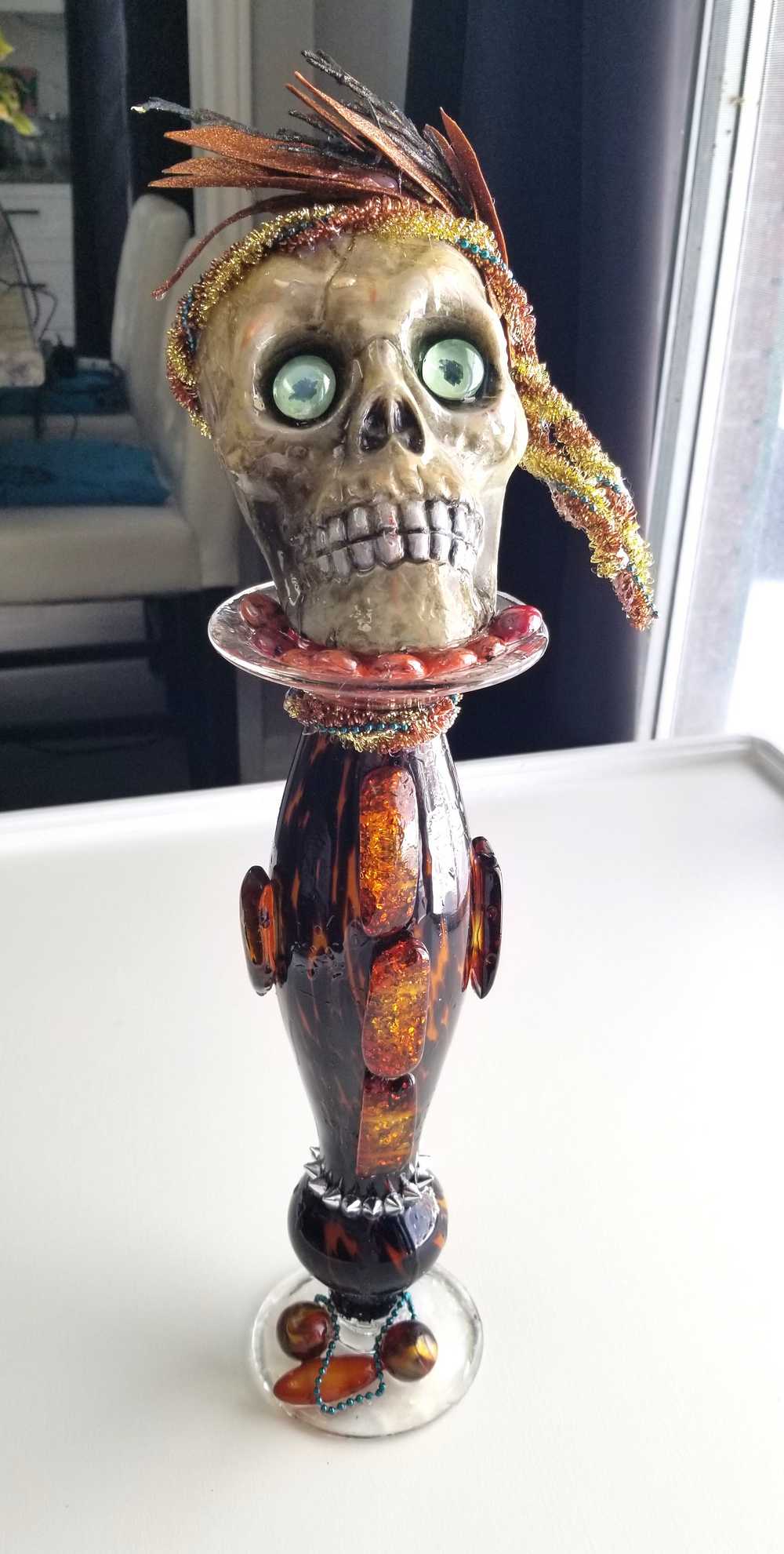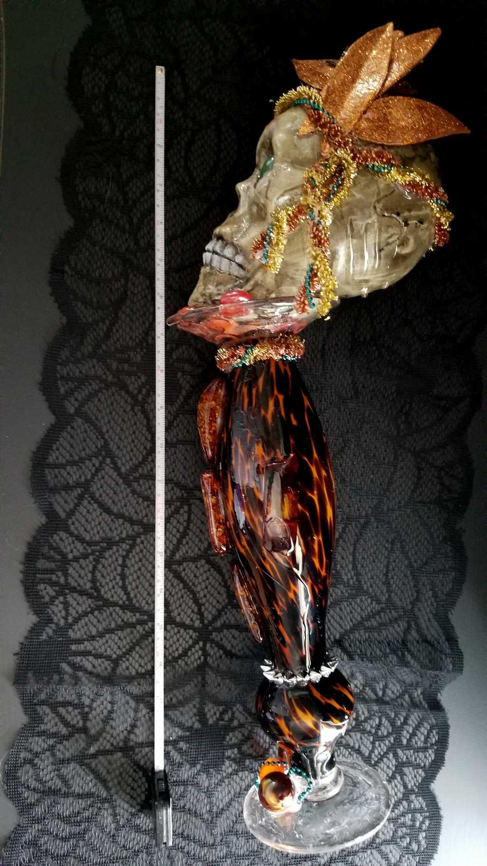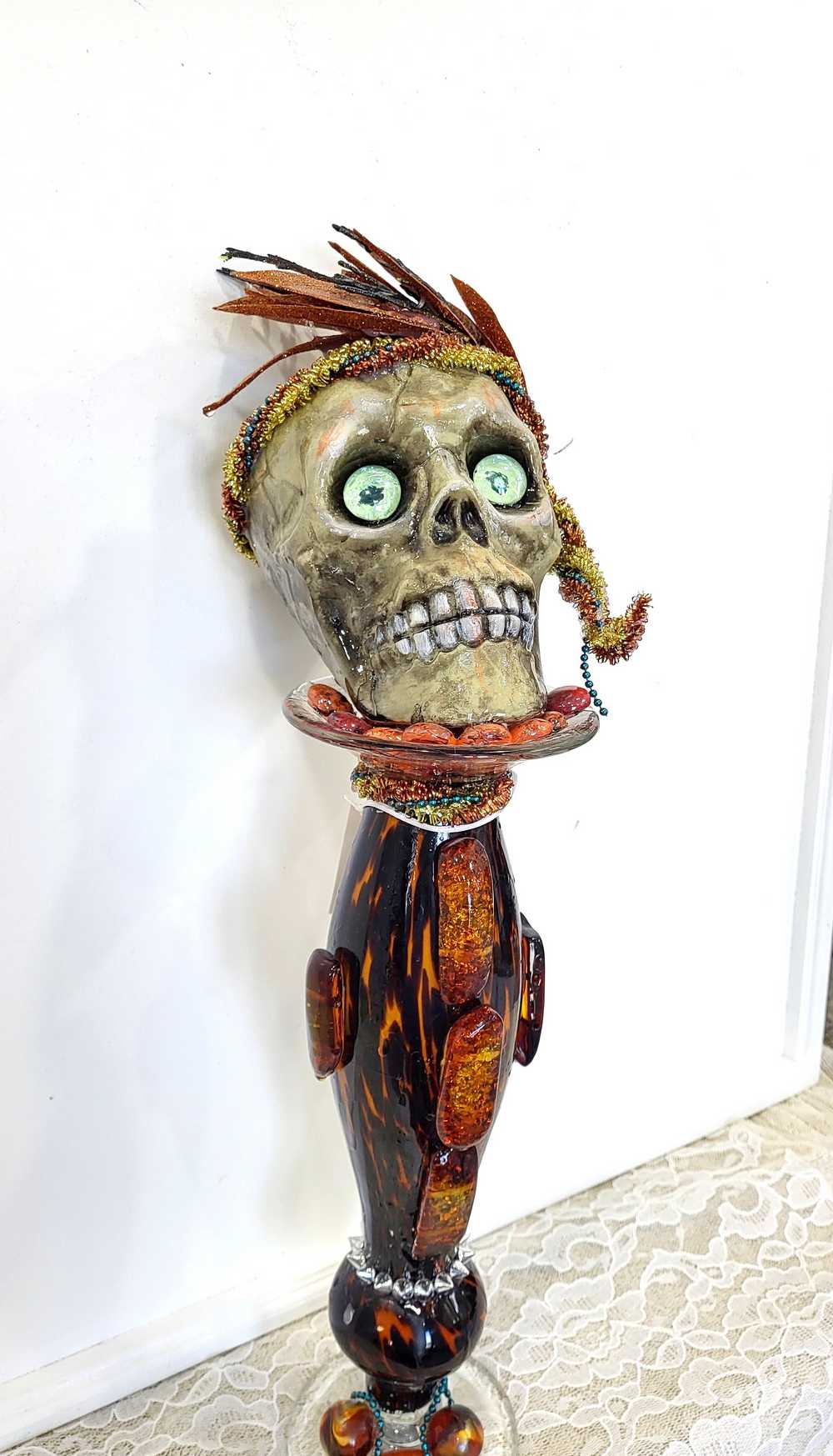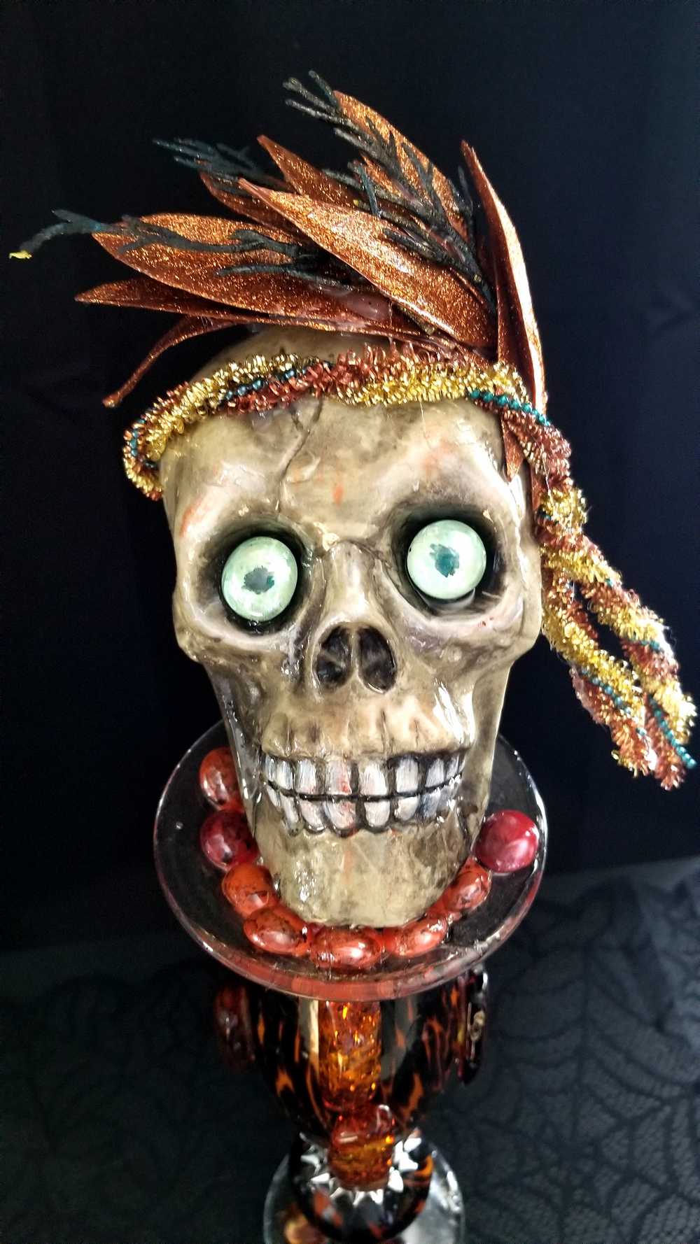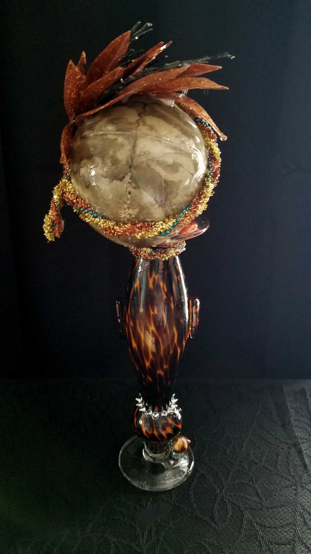 Get wild with this stately and stunning Ellegant Tiger Glass Skull featuring rich black and orange colors, decked out with Silver Studs and Large Amber Beads. Her gold and copper headdress sports a funky teal headband adorned with black sticks and glittery copper leaves. Keep an eye out for her piercing green glass gaze. As if that wasn't enough, the skull also rocks a string of amber beads down her bod and a layer of silver studs at the base. And let's not forget the two large round beads, an oblong bead, and a string of teal beads that add that extra dose of flair. To top it all off, the entire piece is coated in clear resin for a dazzling shine.